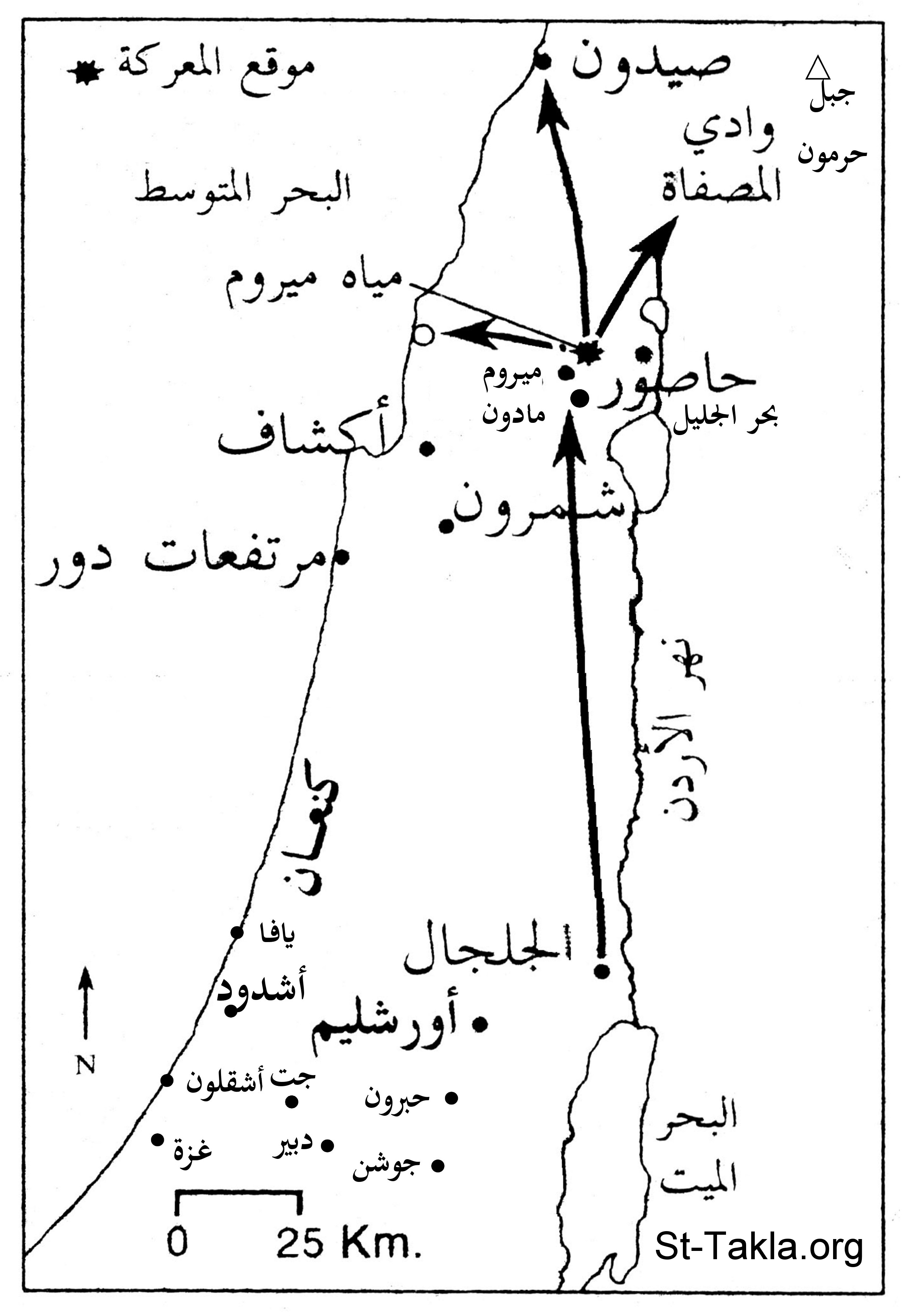 خريطة بالعربية تصور حرب ملوك الشمال ضد إسرائيل (يشوع 11)، مع بعض الأماكن في العهد القديم: البحر المتوسط - صيدون - جبل حرمون - وادي المصفاة - مياه ميروم - حاصور - بحر الجليل - ميروم - مادون - أكشاف - مرتفعات دور - شمرون - نهر الأردن - كنعان - الجلجال - يافا - أشدود - أورشليم - حبرون - جت - أشقلون - جوشن - دبير - غزة - البحر الميت.