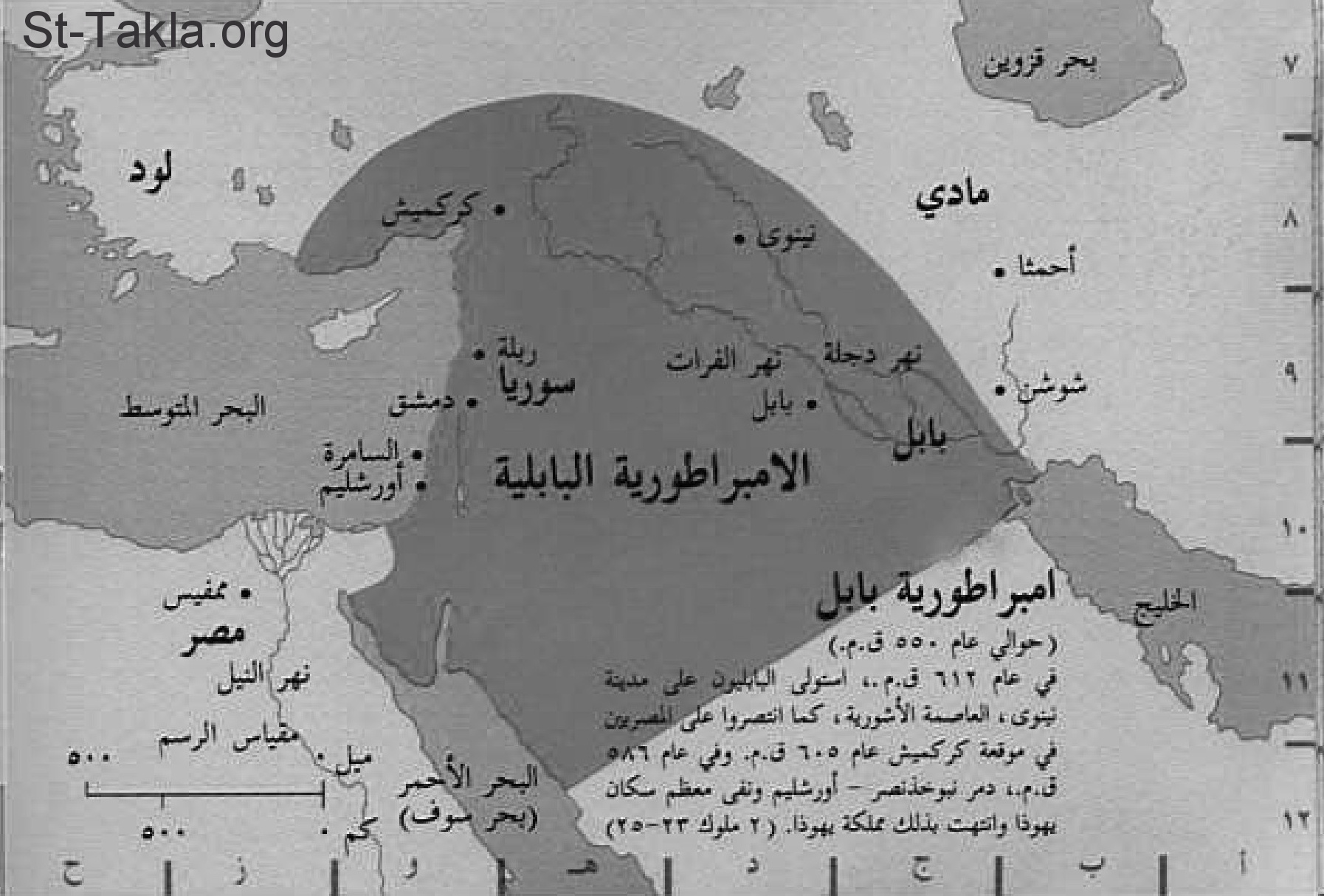 خريطة الإمبراطورية البابلية، ويظهر فيها الأماكن التالية: بحر قزوين، لود، مادي، أحمثا، شوشن، نينوى، كركميش، نهر دجلة، بابل، نهر الفرات، ربلة، سوريا، دمشق، السامرة، أورشليم، البحر المتوسط، مصر، ممفيس، نهر النيل، البحر الأحمر (بحر سوف).