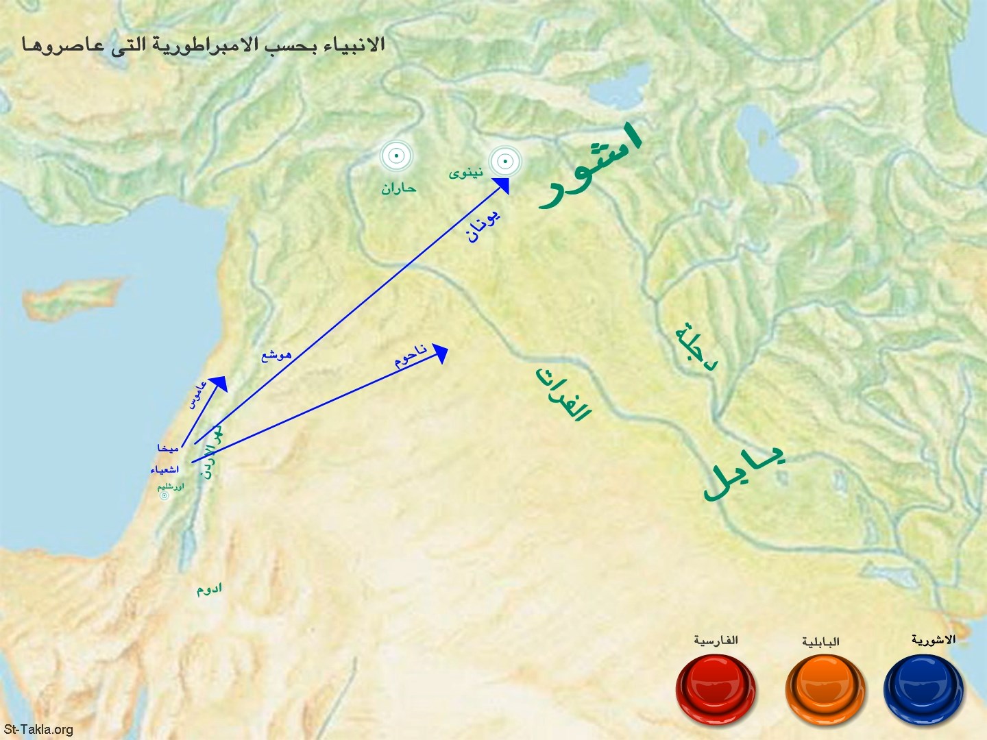 خريطة: أنبياء العهد القديم بحسب الإمبراطوريات القديمة: الإمبراطورية الأشورية (أزرق).