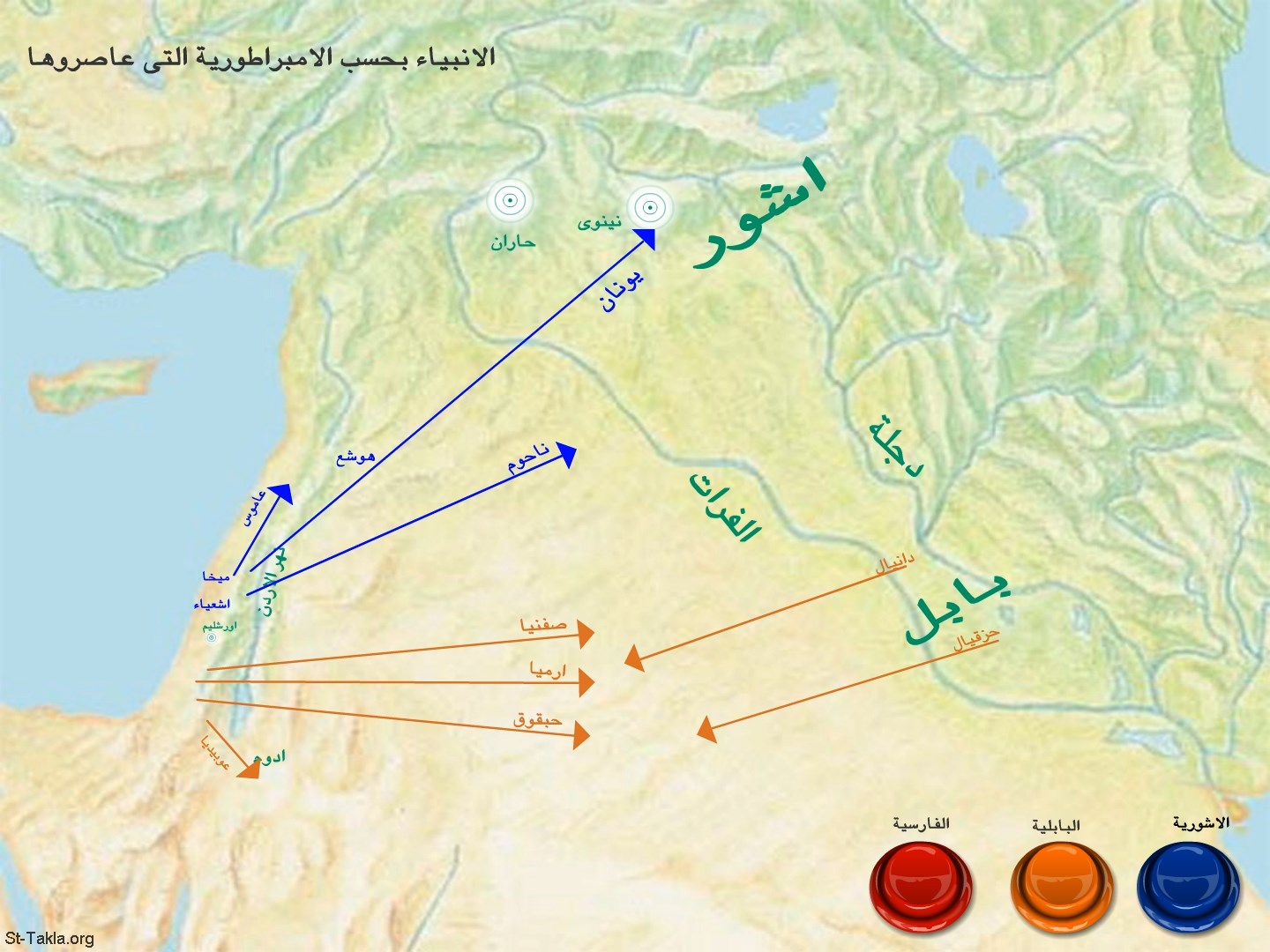 خريطة: أنبياء العهد القديم بحسب الإمبراطوريات القديمة: الإمبراطورية الأشورية (أزرق) - الإمبراطورية البابلية (برتقالي).