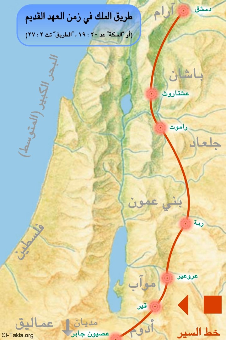 خريطة: طريق الملك في العهد القديم [السكة (العدد 20: 19)؛ الطريق (التثنية 2: 27)].