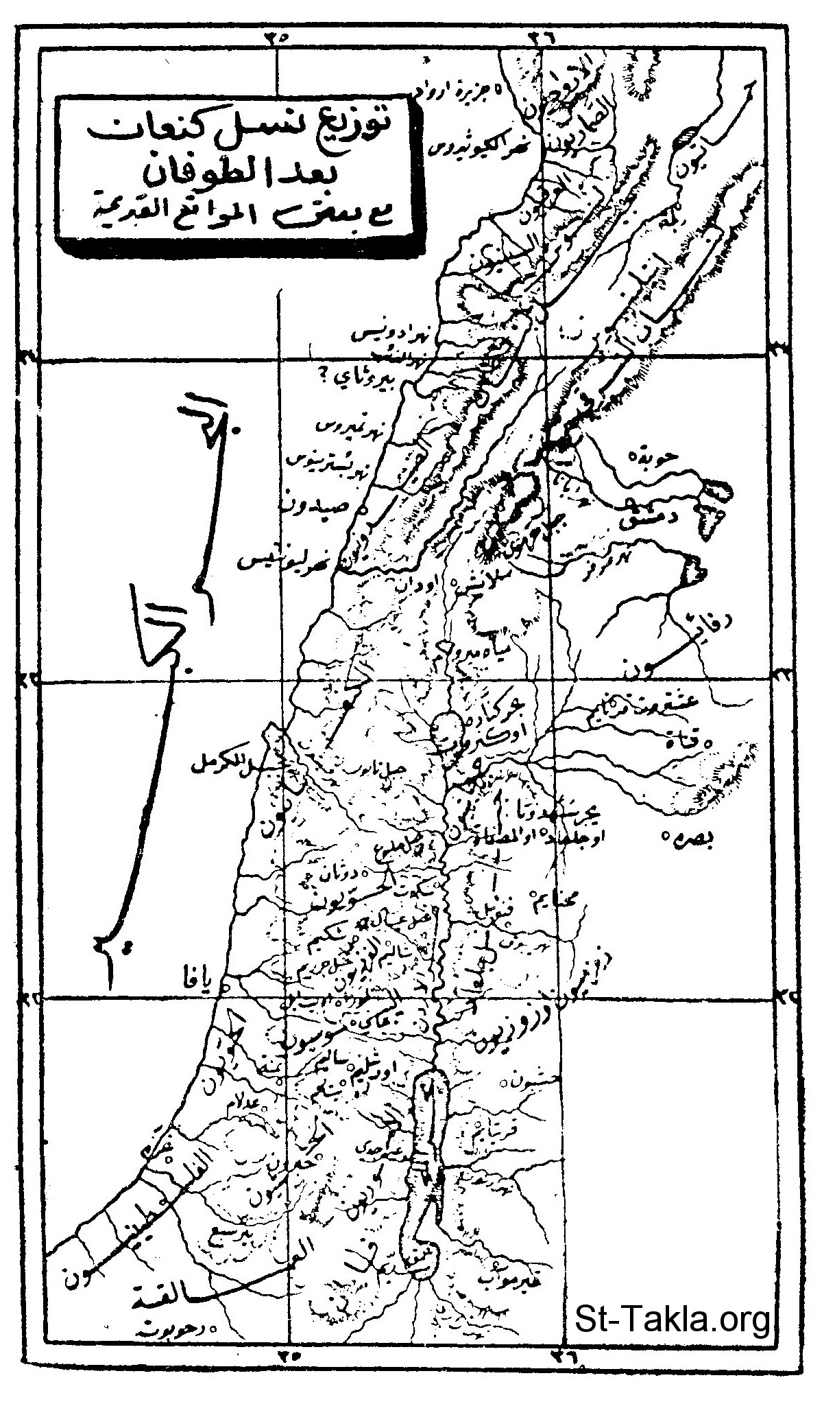 خريطة باللغة العربية: توزيع نسل كنعان بعد الطوفان، مع بعض المواقع القديمة.