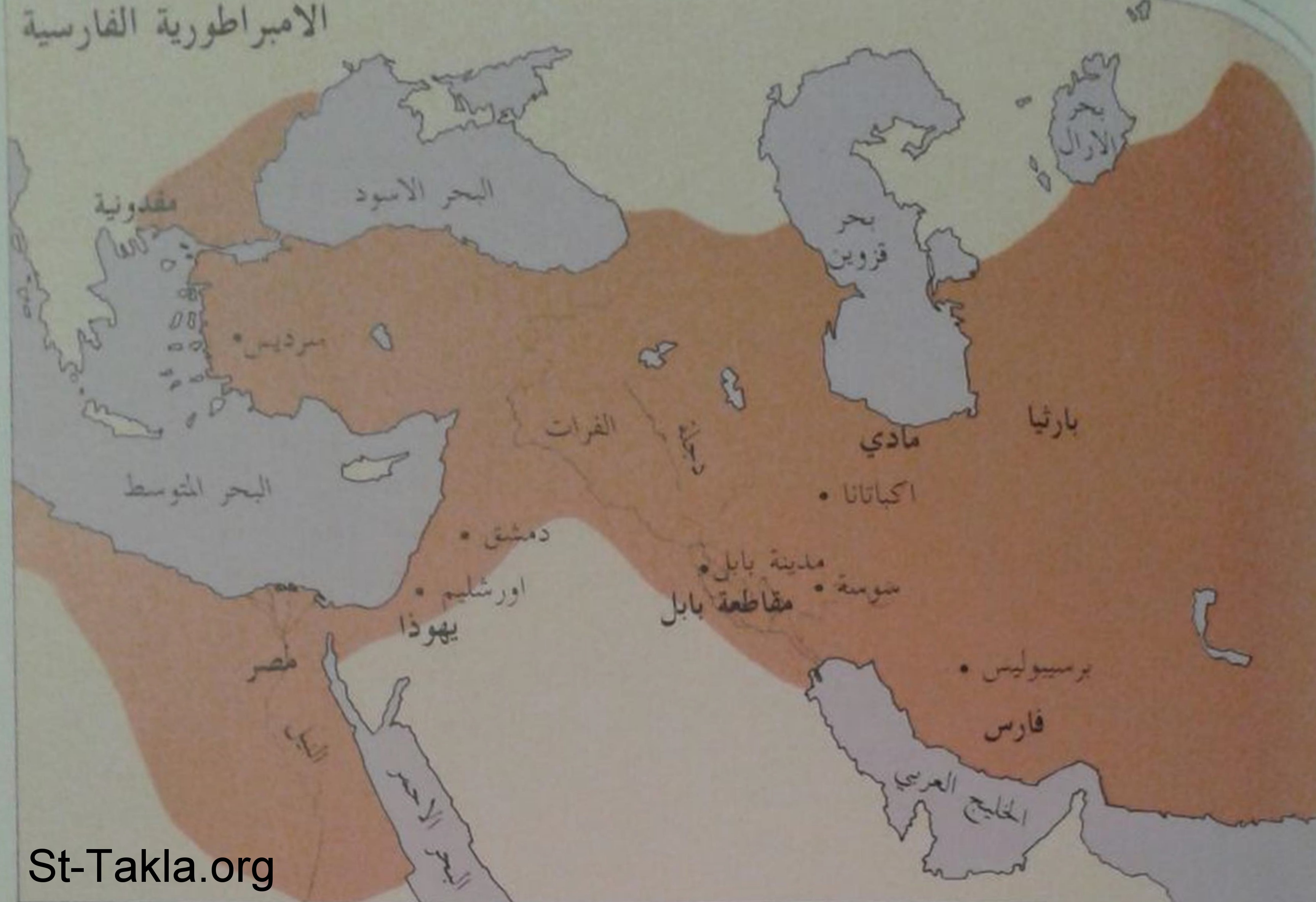 خريطة بالعربية تصور الإمبراطورية الفارسية - وبها بعض الأماكن في العهد القديم: بحر الآرال - بحر قزوين - البحر الأسود - البحر المتوسط - الخليج العربي - البحر الأحمر - بارثيا - مادي - أكباتانا - سوسة - برسيبوليس - فارس - مدينة بابل - مقاطعة بابل - دجلة - الفرات - مقدونية - سرديس (ساردس) - دمشق - أورشليم - يهوذا - مصر - النيل.