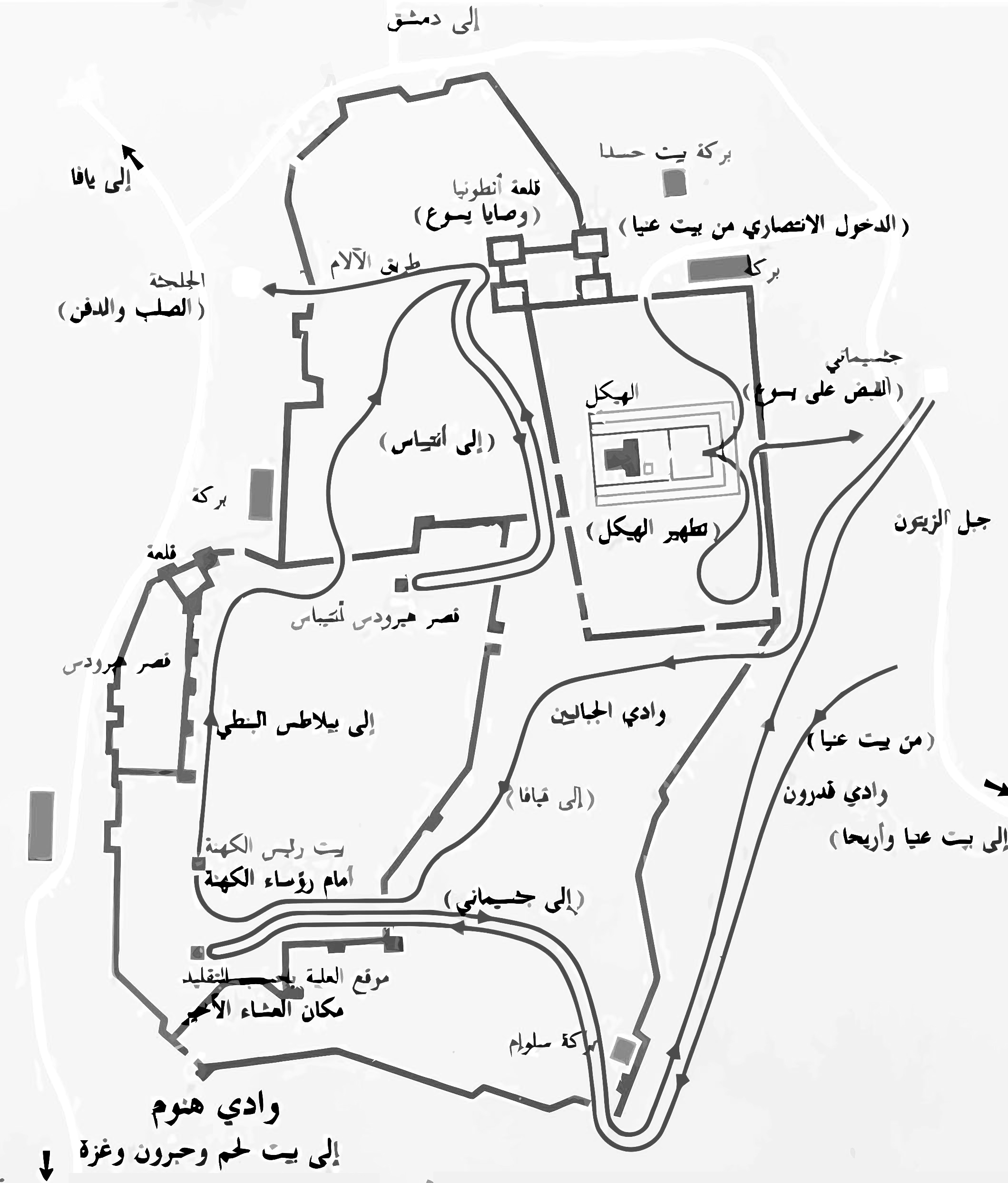 خريطة: أورشليم أثناء أسبوع الآلام (بالعربية) - من كتاب محاكمات السيد المسيح - القمص يوحنا فايز زخاري.