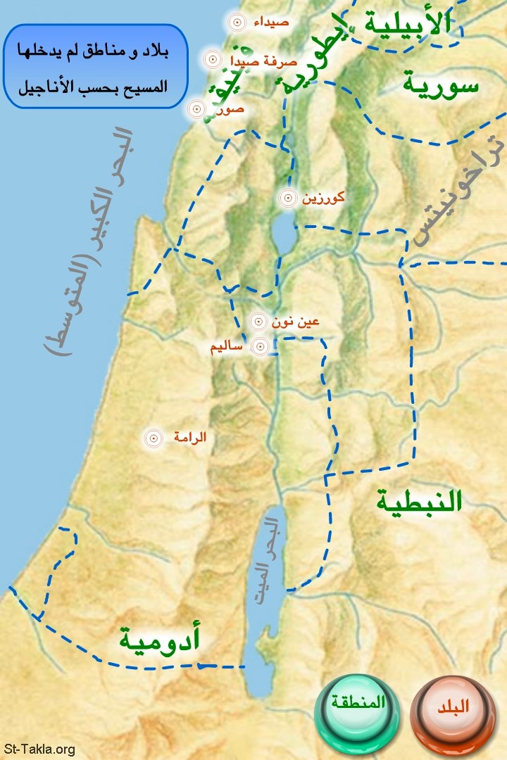 خريطة: بلاد ومناطق لم يدخلها المسيح بحسب الأناجيل.