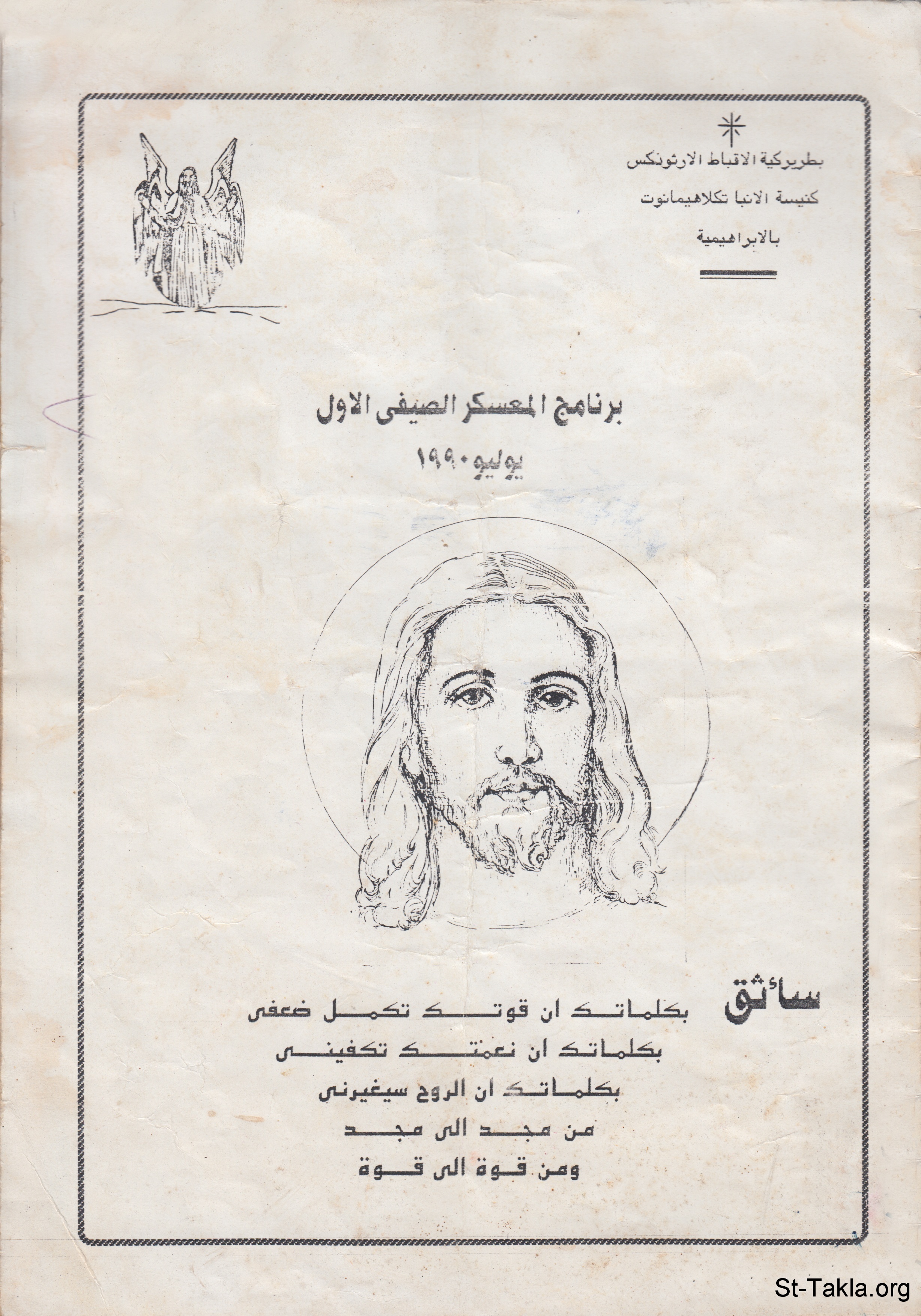 غلاف كتاب ترانيم: برنامج المعسكر الصيفي الأول، يوليو 1990، كنيسة الأنبا تكلاهيمانوت بالإبراهيمية، خدمة إعدادي بنين.