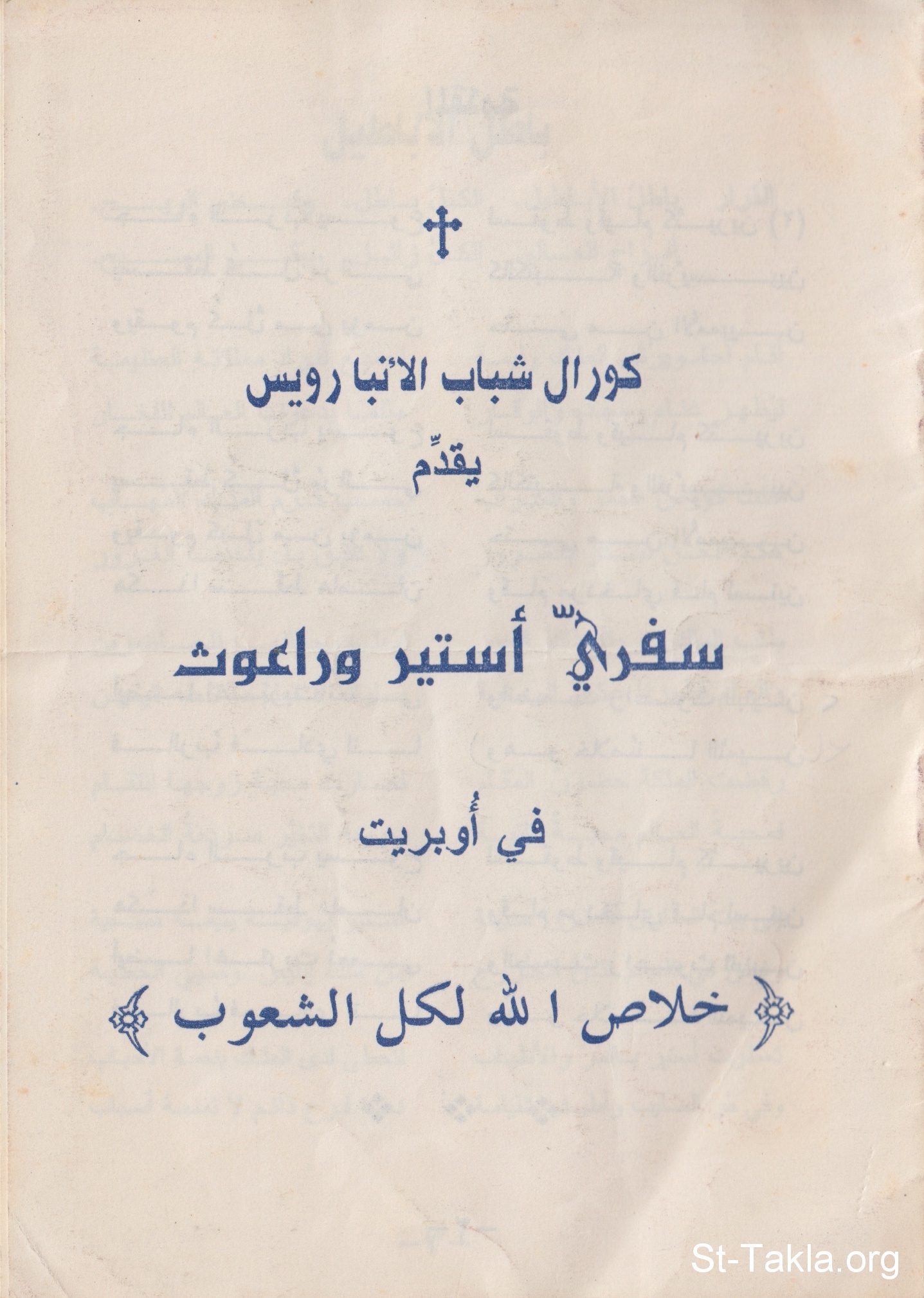 غلاف كتاب الترانيم: سفري أستير وراعوث، في أوبريت: خلاص الله لكل الشعوب، كورال شباب الأنبا رويس.