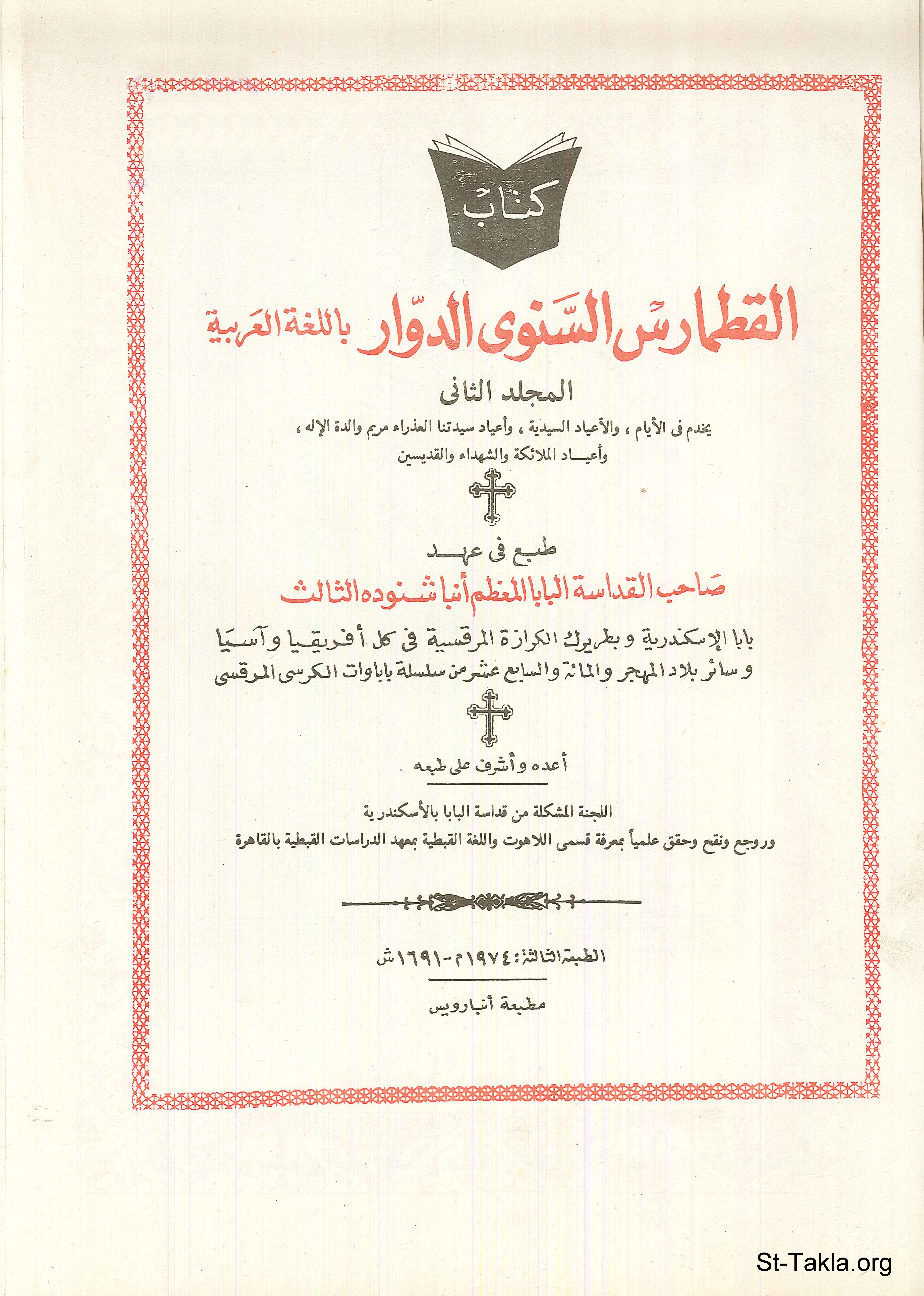 غلاف كتاب "قطماروس الأيام - عربي": القطمارس السنوي الدوار باللغة العربية - المجلد الثاني، يخدم في الأيام، والأعياد السيدية، وأعياد سيدتنا العذراء مريم والدة الإله، وأعياد الملائكة والشهداء والقديسين، الطبعة الثالثة، 1974 م.