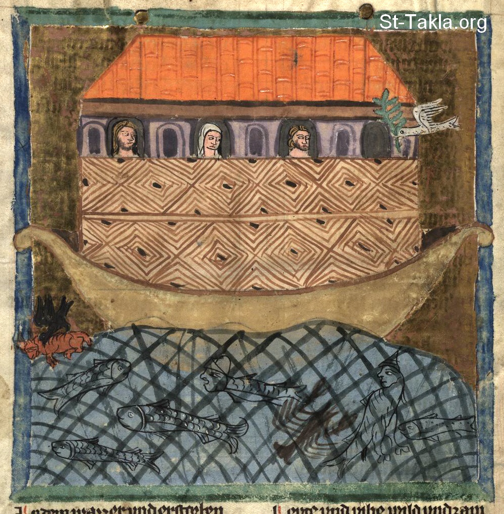 فلك نوح (التكوين 7، 8)، وحمامة تحمل غصن زيتون (التكوين 8: 8-11) - من مخطوط كتاب تاريخ العالم (ويلتكرونيك)، رودلف فون إمس، في الفترة ما بين 1350-1375 م.