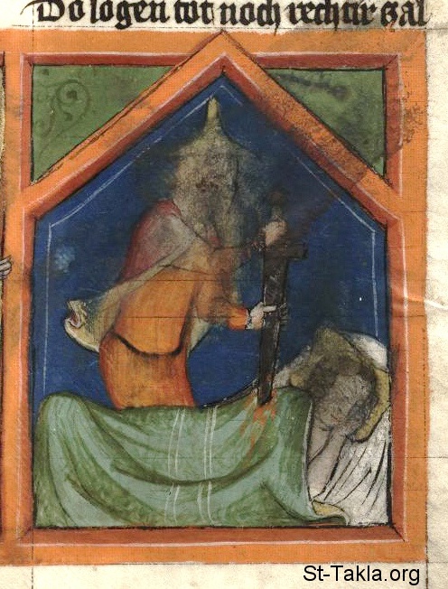 فينحاس يقتل زمري وكزبي بجانبه: "كان اسم الرجل الإسرائيلي المقتول الذي قتل مع المديانية زمري بن سالو رئيس بيت أب من الشمعونيين. واسم المراة المديانية المقتولة كزبي بنت صور" (العدد 25 :14-15) - من مخطوط كتاب تاريخ العالم (ويلتكرونيك)، رودلف فون إمس، في الفترة ما بين 1350-1375 م.