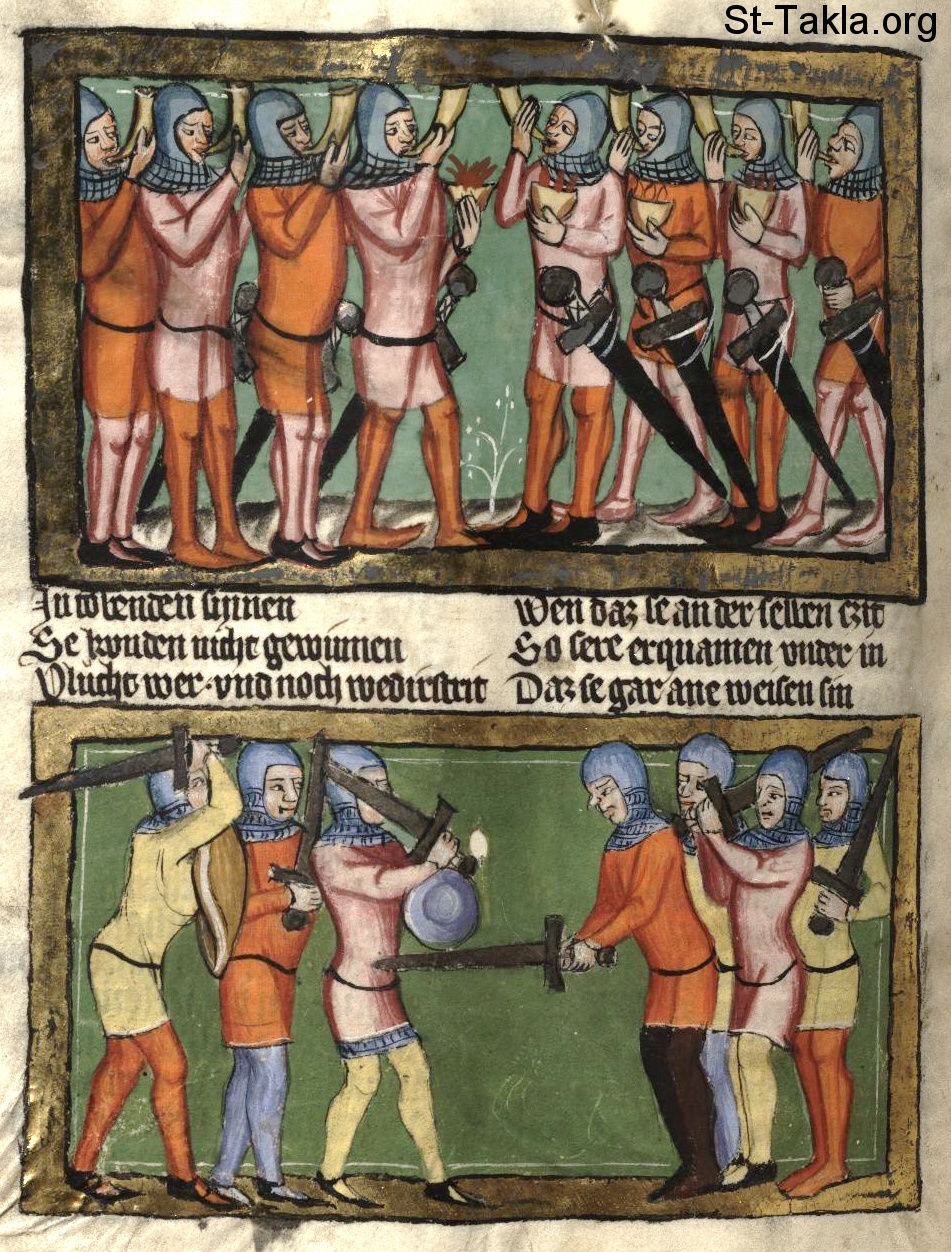 المحاربون مع جدعون يحملون أبواقهم (القضاة 7: 8)؛ الأعداء (المديانيون والعمالقة وكل بني المشرق) يقتلون بعضهم بعضًا بالخطأ بسبب ذعرهم (القضاة 7: 16-22) - من مخطوط كتاب تاريخ العالم (ويلتكرونيك)، رودلف فون إمس، في الفترة ما بين 1350-1375 م.