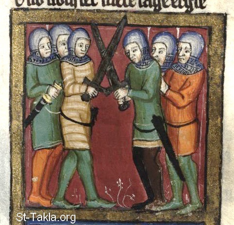 المعركة ضد البنيامينيين (القضاة 20: 40-48) - من مخطوط كتاب تاريخ العالم (ويلتكرونيك)، رودلف فون إمس، في الفترة ما بين 1350-1375 م.