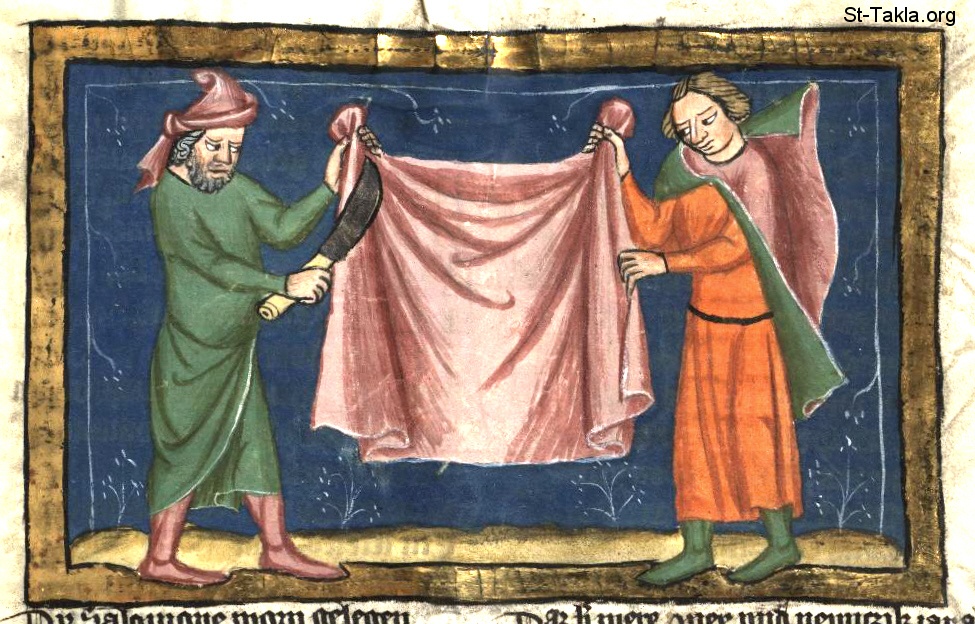 أخيا الشيلوني النبي يمزق رداءه أمام يربعام (الملوك الأول 11: 29-39) - من مخطوط كتاب تاريخ العالم (ويلتكرونيك)، رودلف فون إمس، في الفترة ما بين 1350-1375 م.