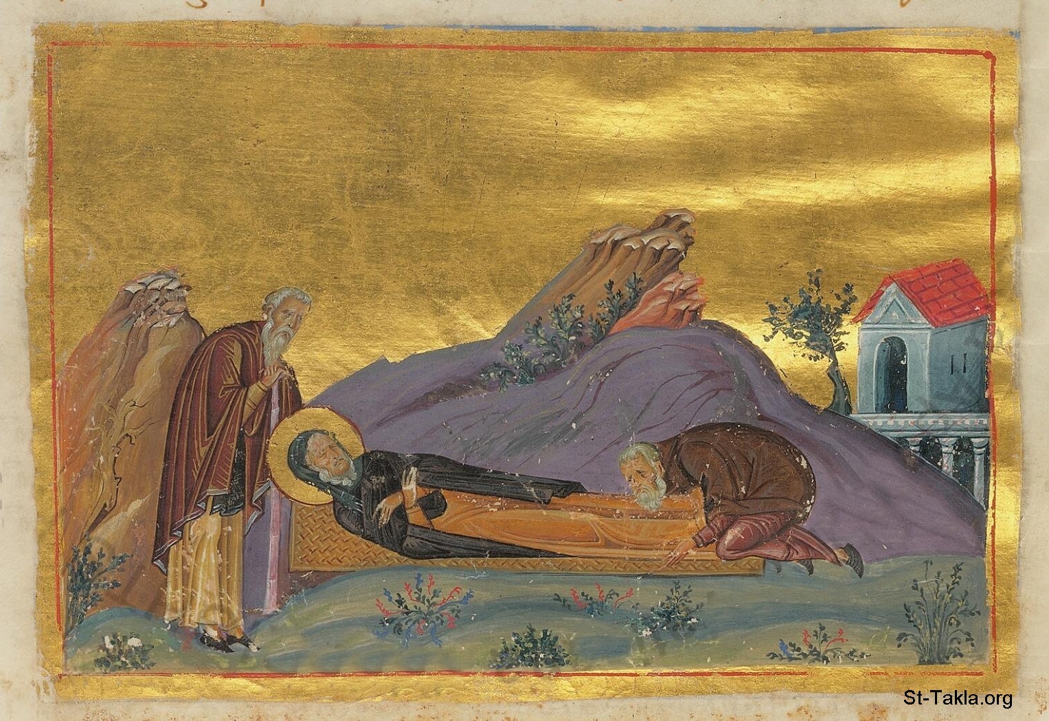 دفن جسد الأنبا أنطونيوس الكبير بواسطة تلميذيه - من مخطوط كتاب خدمات الإمبراطور باسيليوس الثاني، القرن العاشر، مكتبة الفاتيكان.