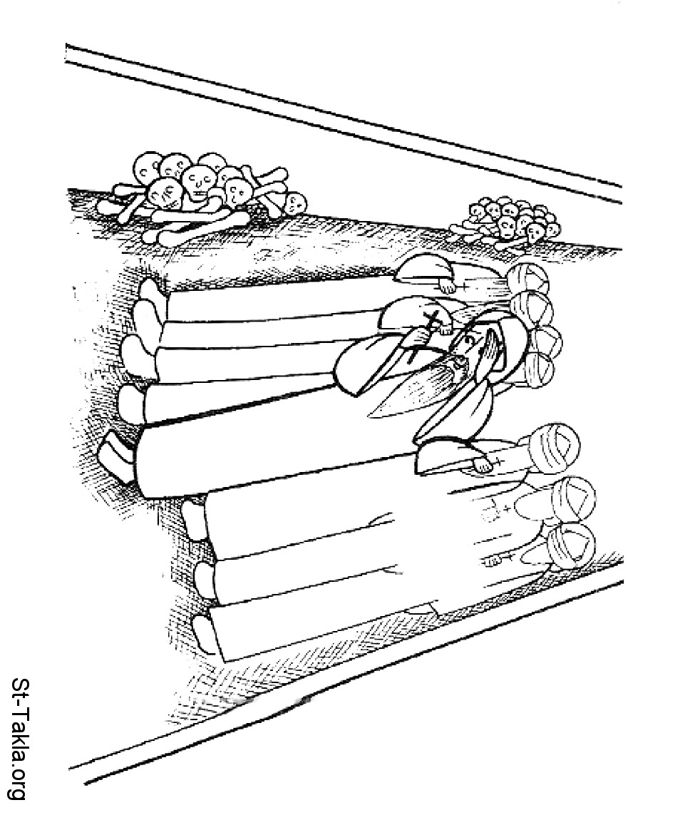 طافوس الرهبان (المدافن)، وأب راهب حي مستلقي مع باقي الجثامين - رسم فن قبطي حديث من كتاب ثلاث قصص هادفة - البابا شنوده الثالث.