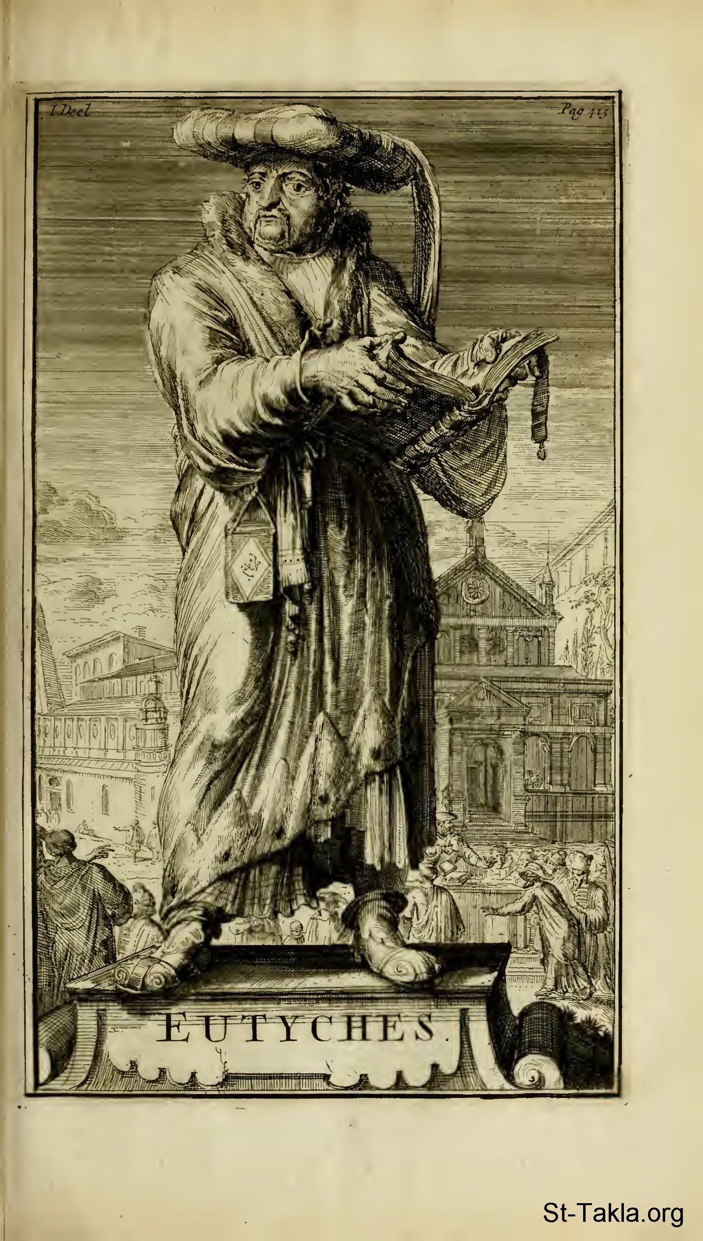 أوطاخي المهرطق (أوطيخا، يوتيخوس)، راعي ورئيس دير بالقسطنطينية (380-456) - من صور كتاب "تاريخ الكنيسة والهراطقة"، ج1، تأليف: جوتفرايد أرنولد، رومين دي هوغ، سيباستيان بيتزولد، إصدار 1701 م.