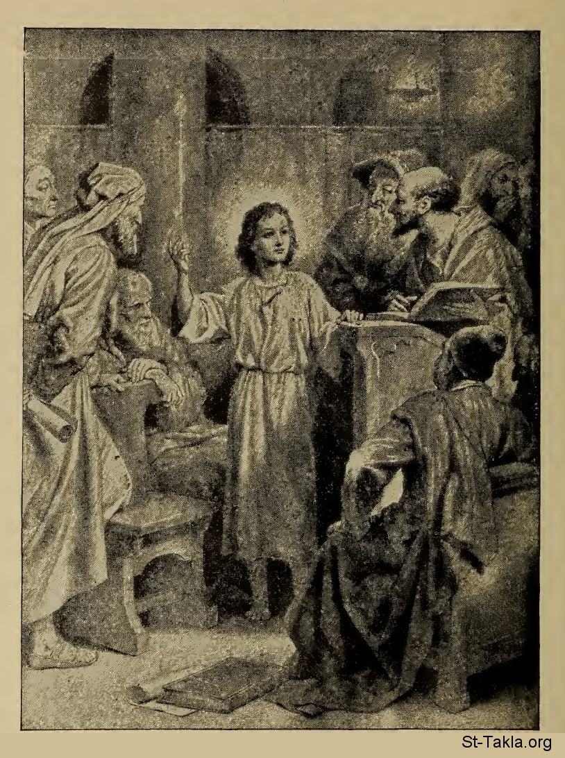 "وبعد ثلاثة أيام وجداه في الهيكل، جالسا في وسط المعلمين، يسمعهم ويسألهم." (إنجيل لوقا 2: 46) - من كتاب المسيح مخلصنا، إلين ج. وايت، 1896، 1900 م.