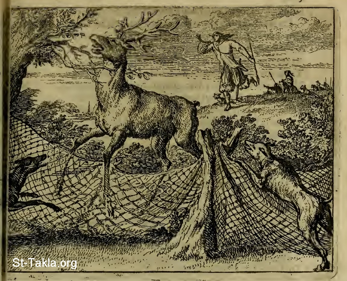 "نج نفسك كالظبي من اليد" (الأمثال 6: 5) - من صور من كتاب "حصن الروح"، تأليف: فرانس فان هوجستراتن، رومين دي هوغ، إنجيلبيرتوس سولمانز، هندريك فان بيور، إصدار 1698 م.