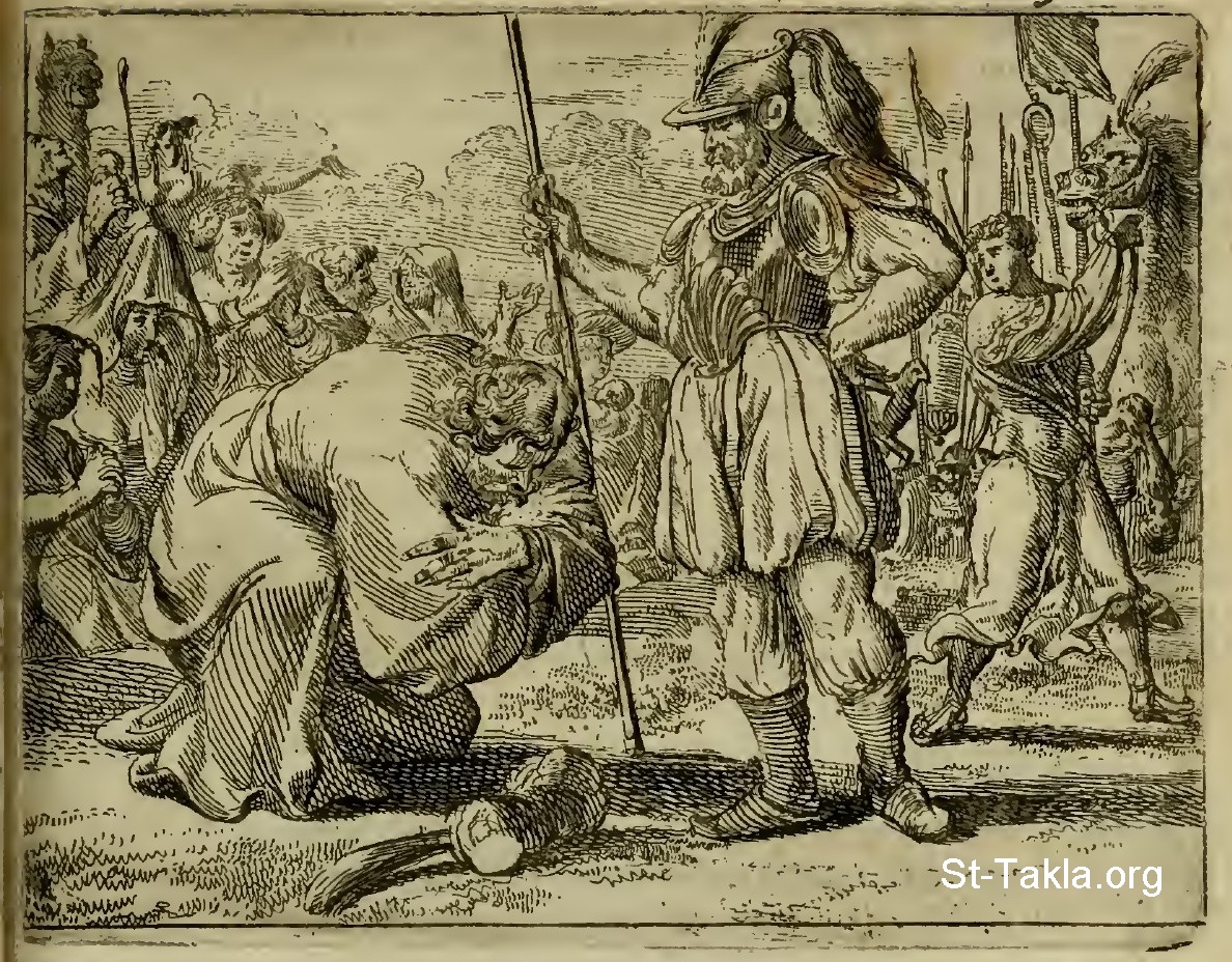 "ورفع يعقوب عينيه ونظر وإذا عيسو مقبل.. وأما هو فاجتاز قدامهم وسجد إلى الأرض سبع مرات حتى اقترب إلى أخيه" (التكوين 33: 1، 3) - من صور من كتاب "حصن الروح"، تأليف: فرانس فان هوجستراتن، رومين دي هوغ، إنجيلبيرتوس سولمانز، هندريك فان بيور، إصدار 1698 م.