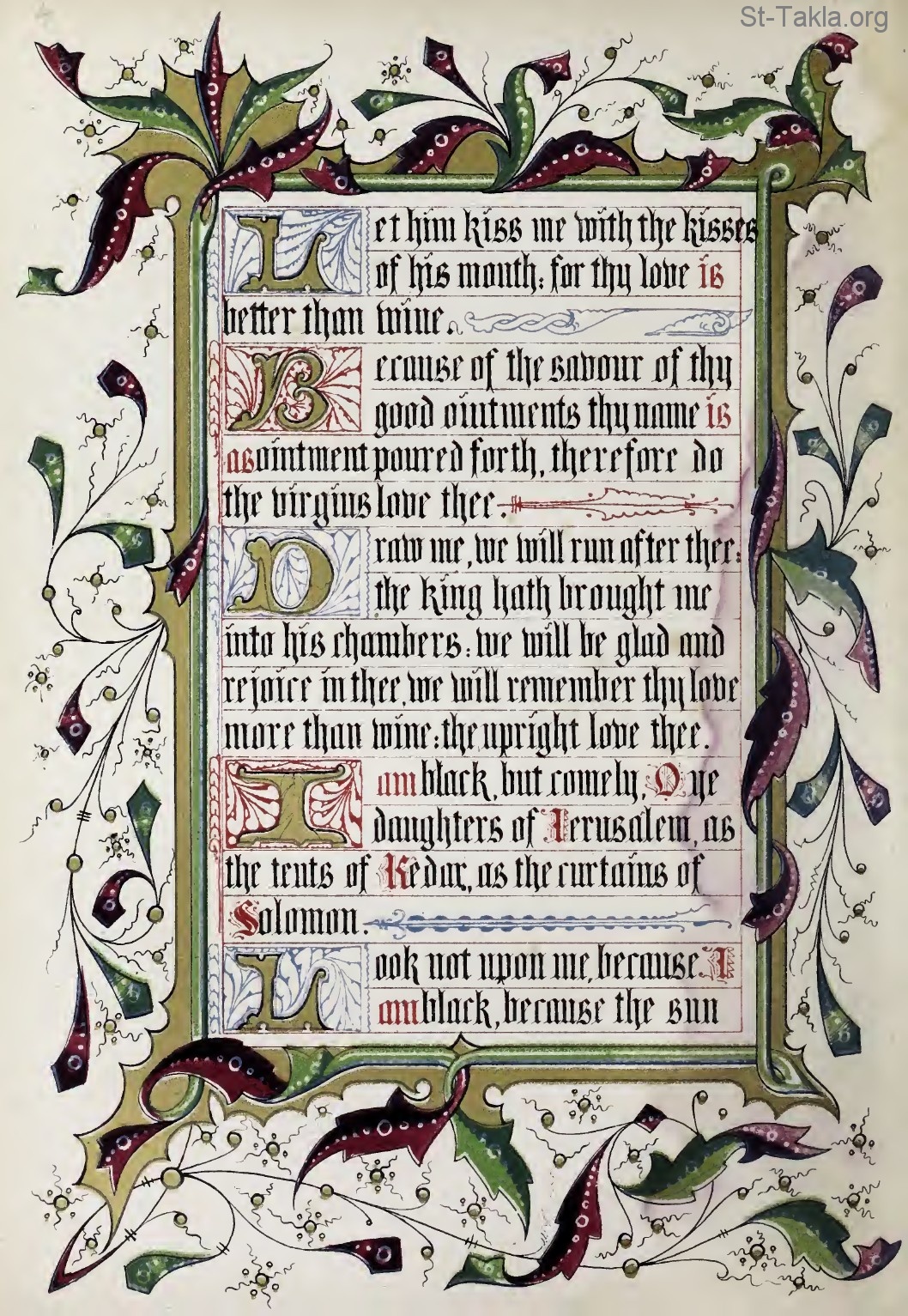 "ليقبلني بقبلات فمه، لأن حبك أطيب من الخمر. لرائحة أدهانك الطيبة. اسمك دهن مهراق، لذلك أحبتك العذارى. اجذبني وراءك فنجري. أدخلني الملك إلى حجاله. نبتهج ونفرح بك. نذكر حبك أكثر من الخمر. بالحق يحبونك. أنا سوداء وجميلة يا بنات أورشليم، كخيام قيدار، كشقق سليمان. لا تنظرن إلي لكوني سوداء، لأن الشمس قد لوحتني." (النشيد 1: 2-6). - كتاب سفر نشيد الأنشاد، خطوط الفنان أوين جونز، 1849 م.