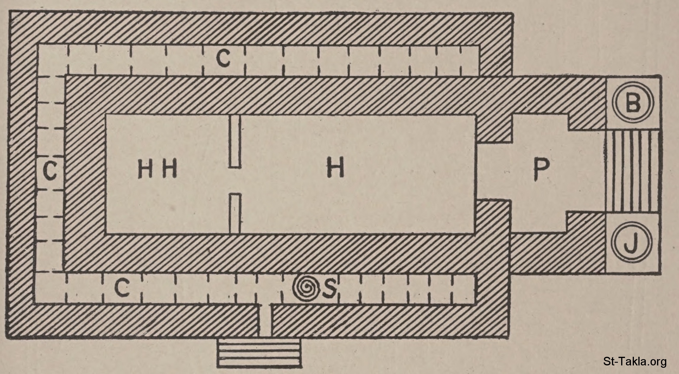 Ground plan of Holy House Solomon’s Temple (P, Porch; H, Holy Place; H H, Holy of Holies; S, Stairway to Chambers; C C, Chambers; B, T, Pillars Boaz and Tachin.) - from the book: The Universal Bible Dictionary, edited by: F. N. Peloubet, 1912.