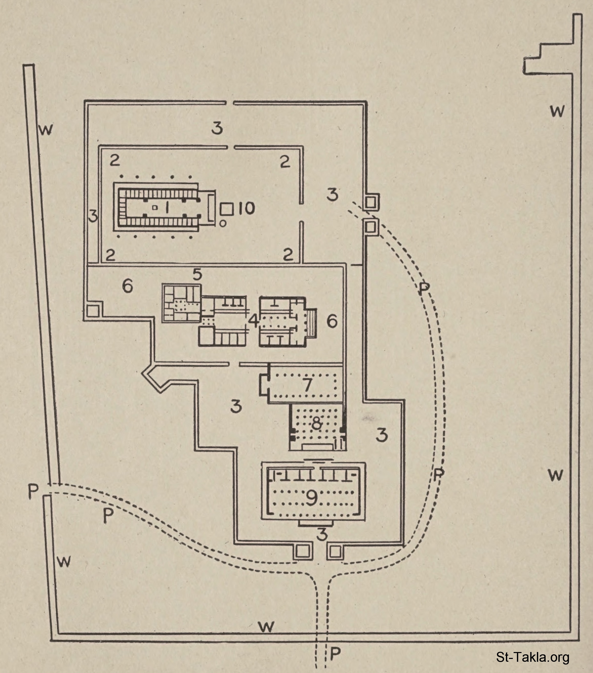 تخطيط أرضي لمبنى سليمان على جبل الهيكل: (1- الهيكل، 2- الساحة، 3- الساحة الخارجية، 4- بيت الملك، 5- بيت ابنة فرعون، 6- الساحة الأخرى: الوسطى، 7- قاعة االعرش، 8- قاعة الأعمدة، 9- منزل غابة لبنان، P: المصاعد للقصر والهيكل، W: حوائط الهيكل الحالية) - من كتاب: قاموس الكتاب المقدس العالمي، تحرير: ف. ن. بالوبيت، 1912 م.