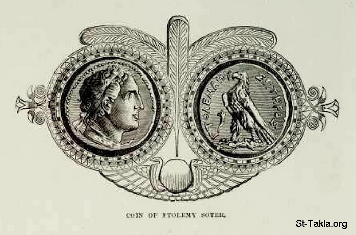 عملة بطليموس سوتر (بطليموس الأول)، رسم الفنان لودفيج بيرجر - من صور كتاب: مصر: وصفيًّا، تاريخيًّا وتصويريًّا - جزء 1 - لـ جيورج إبيرس (ترجمة كلارا كورتناي بوينتر بيل)، 1885 م.