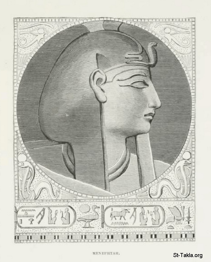 الملك مرنبتاح، رسم الفنان لودفيج بيرجر - من صور كتاب: مصر: وصفيًّا، تاريخيًّا وتصويريًّا - جزء 1 - لـ جيورج إبيرس (ترجمة كلارا كورتناي بوينتر بيل)، 1885 م.