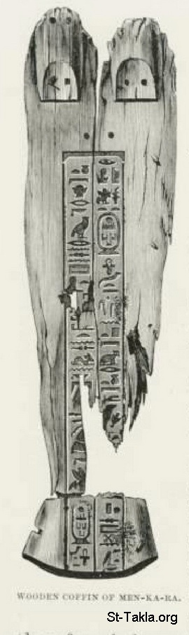 تابوت خشبي لـ منقرع، رسم الفنان ب. ستراسبيرجر - من صور كتاب: مصر: وصفيًّا، تاريخيًّا وتصويريًّا - جزء 1 - لـ جيورج إبيرس (ترجمة كلارا كورتناي بوينتر بيل)، 1885 م.