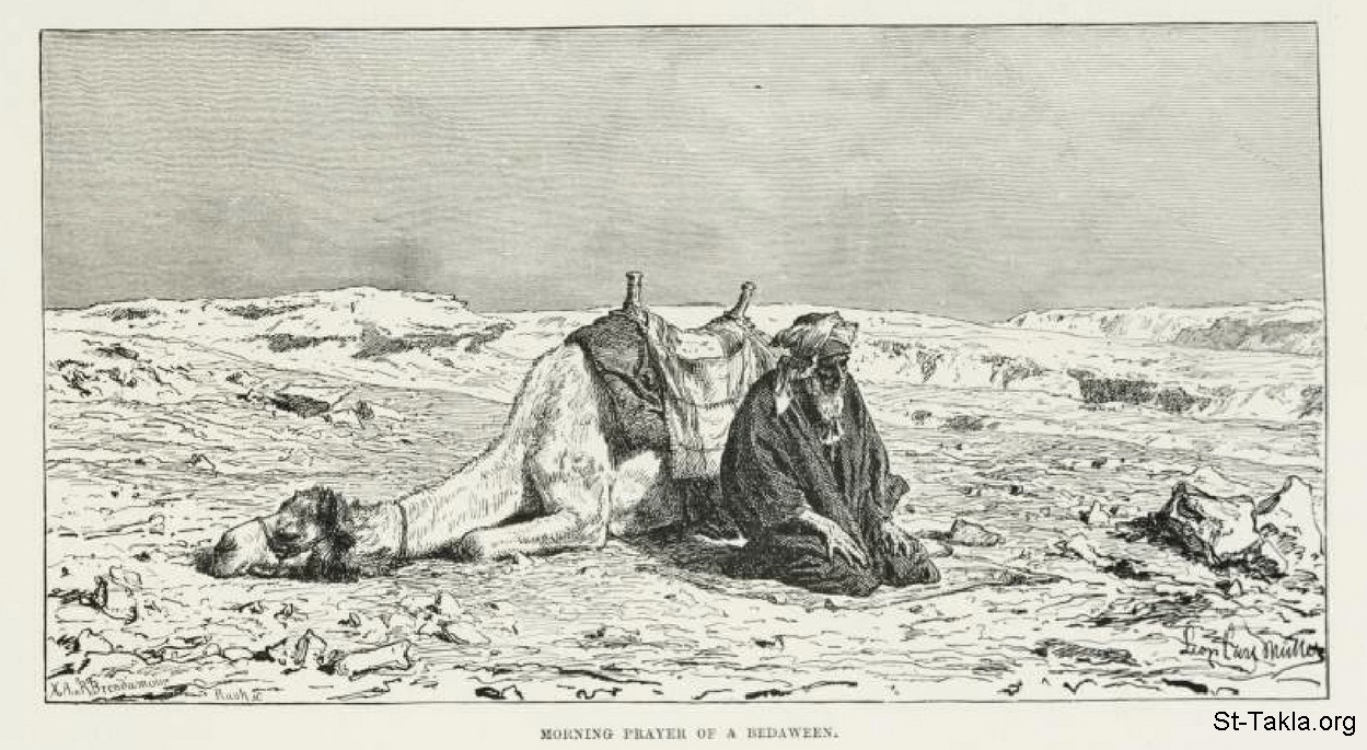 صلاة الفجر لأحد البدويين، رسم الفنان ليوبولد كارل مولر - من صور كتاب: مصر: وصفيًّا، تاريخيًّا وتصويريًّا - جزء 1 - لـ جيورج إبيرس (ترجمة كلارا كورتناي بوينتر بيل)، 1885 م.