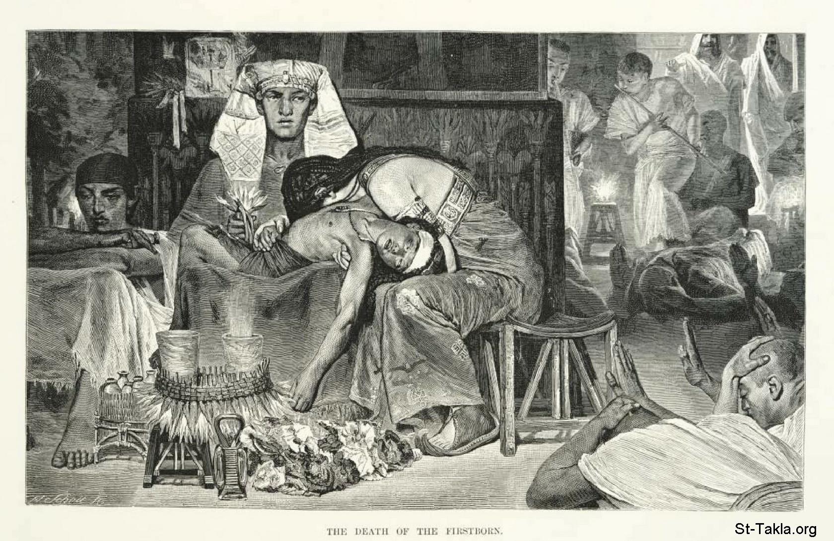 موت الأبكار، رسم الفنان ألما تاديما - من صور كتاب: مصر: وصفيًّا، تاريخيًّا وتصويريًّا - جزء 1 - لـ جيورج إبيرس (ترجمة كلارا كورتناي بوينتر بيل)، 1885 م.
