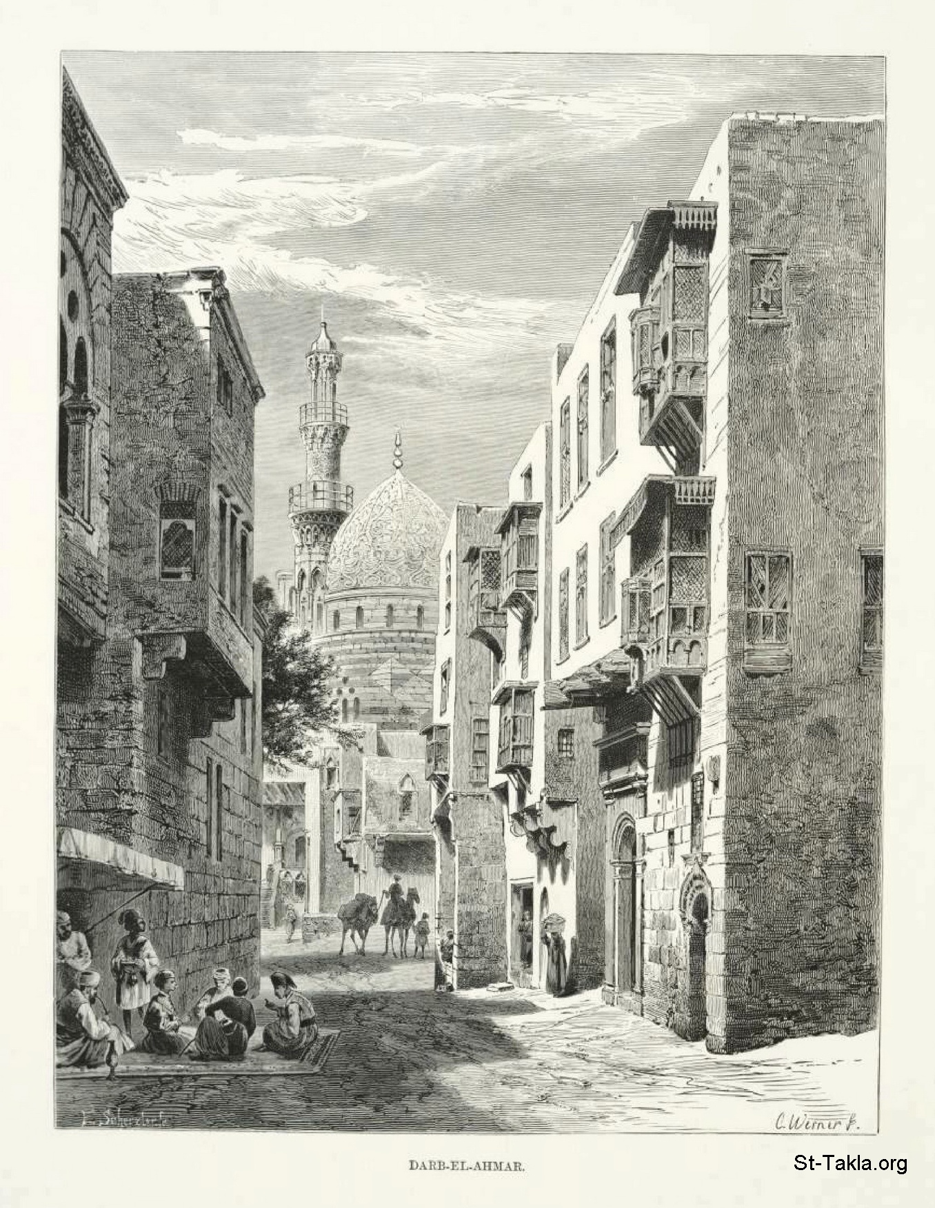 الدرب الأحمر بالقاهرة، رسم الفنان كارل فيرنر - من صور كتاب: مصر: وصفيًّا، تاريخيًّا وتصويريًّا - جزء 1 - لـ جيورج إبيرس (ترجمة كلارا كورتناي بوينتر بيل)، 1885 م.