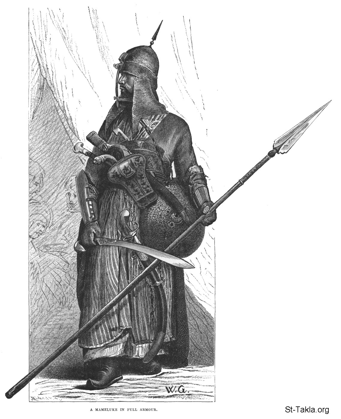 مملوك: أحد المماليك مع درع واق كامل للحرب، مع سيف وحربة، رسم الفنان ويلهلم جينز - من صور كتاب: مصر: وصفيًّا، تاريخيًّا وتصويريًّا - جزء 2 - لـ جيورج إبيرس (ترجمة كلارا كورتناي بوينتر بيل)، 1885 م.