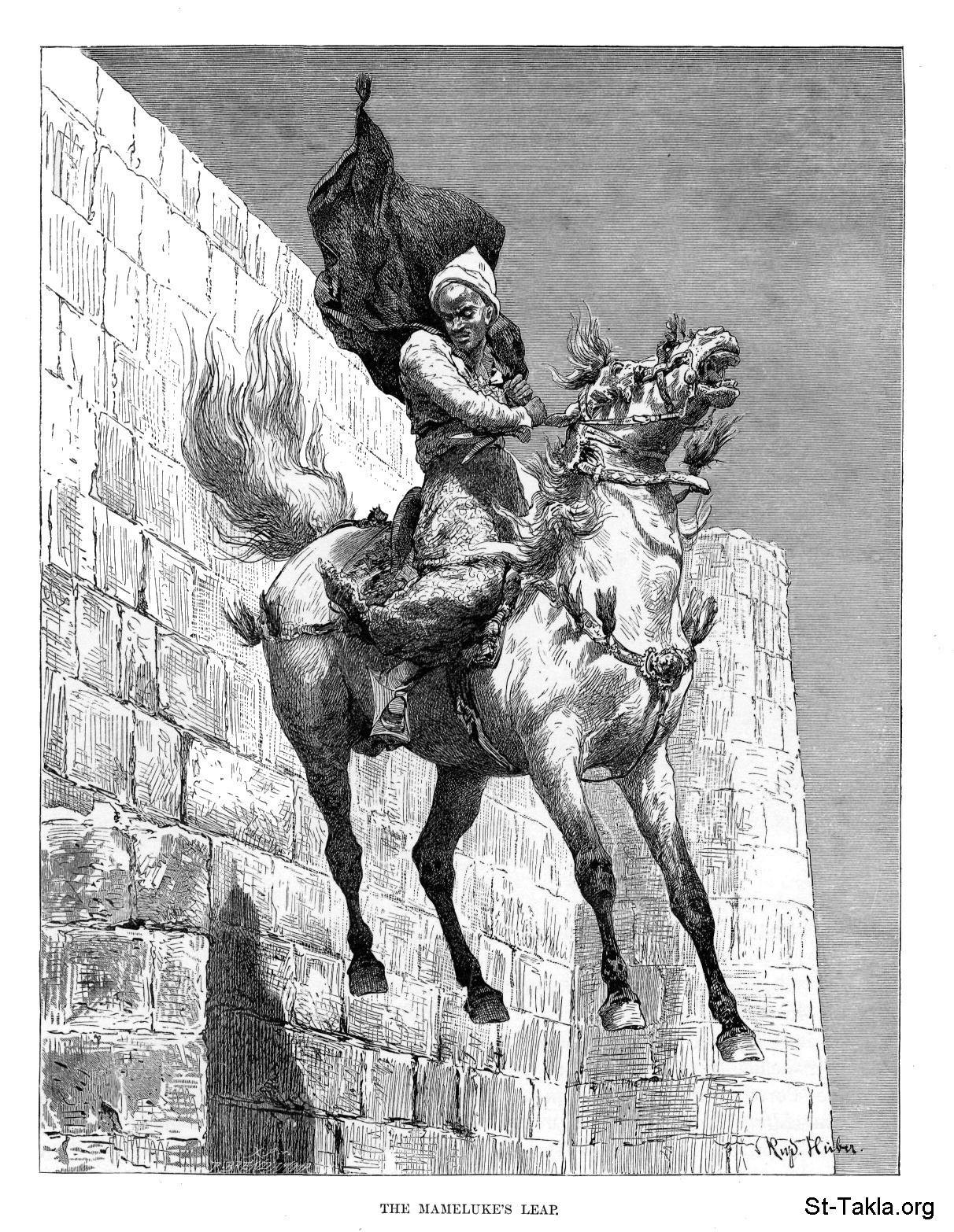 قفزة المملوك أمين (هيجشوكور) هربًا من مذبحة القلعة، رسم الفنان سي. رودلف هوبر - من صور كتاب: مصر: وصفيًّا، تاريخيًّا وتصويريًّا - جزء 2 - لـ جيورج إبيرس (ترجمة كلارا كورتناي بوينتر بيل)، 1885 م.