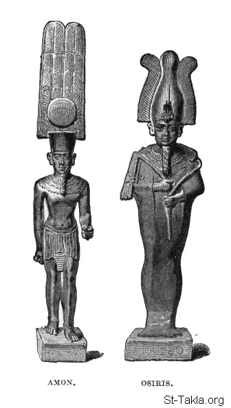 أمون، أوزوريس، رسم الفنان أوجوست رامستهال - من صور كتاب: مصر: وصفيًّا، تاريخيًّا وتصويريًّا - جزء 2 - لـ جيورج إبيرس (ترجمة كلارا كورتناي بوينتر بيل)، 1885 م.