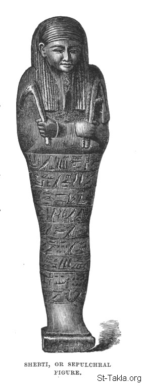 تمثال الأوشبتي: أوشابتي، رسم الفنان ب. ستراسبيرجر - من صور كتاب: مصر: وصفيًّا، تاريخيًّا وتصويريًّا - جزء 2 - لـ جيورج إبيرس (ترجمة كلارا كورتناي بوينتر بيل)، 1885 م.