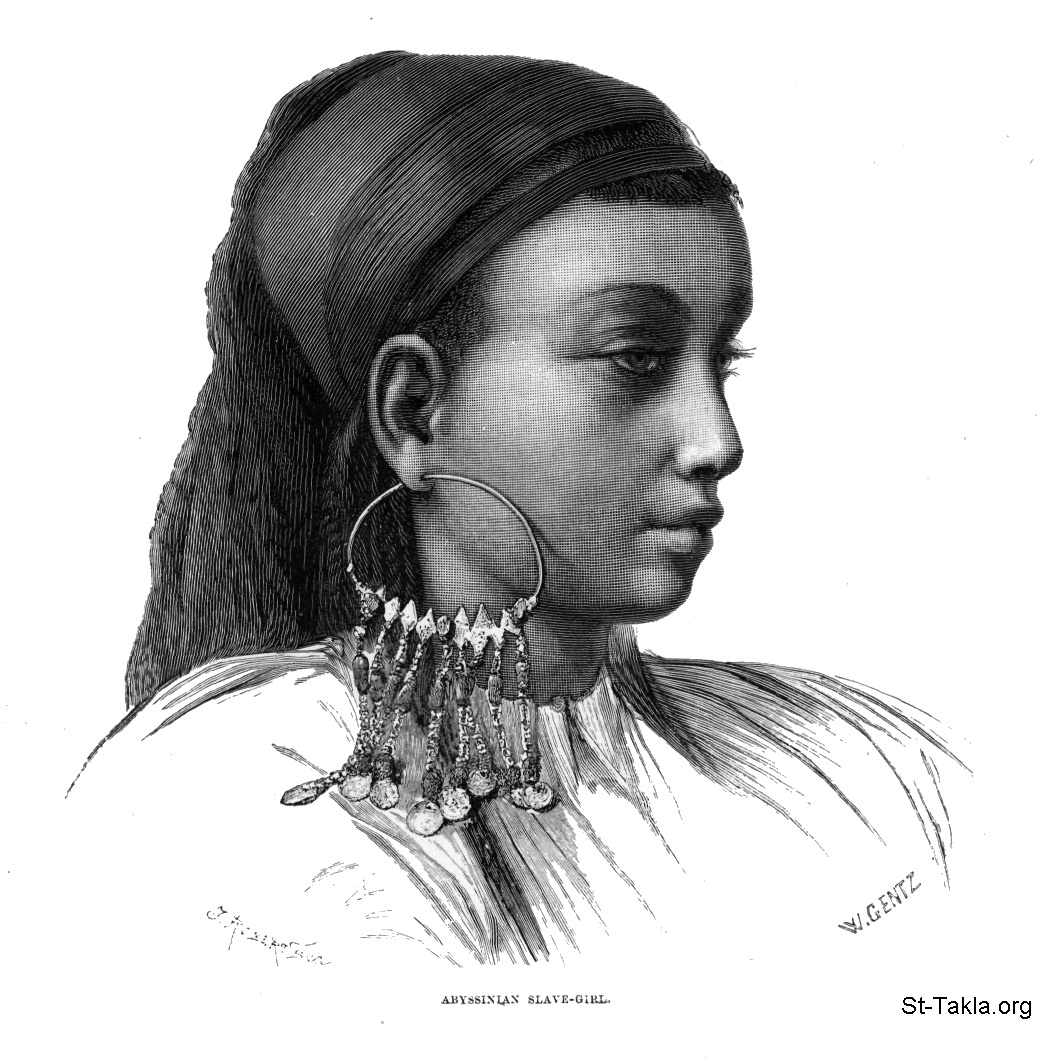 عبدة حبشية، رسم الفنان ويلهلم جينز - من صور كتاب: مصر: وصفيًّا، تاريخيًّا وتصويريًّا - جزء 2 - لـ جيورج إبيرس (ترجمة كلارا كورتناي بوينتر بيل)، 1885 م.