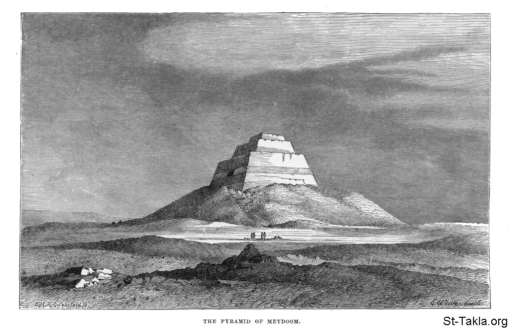هرم ميدوم، رسم الفنان فيدينباخ - من صور كتاب: مصر: وصفيًّا، تاريخيًّا وتصويريًّا - جزء 2 - لـ جيورج إبيرس (ترجمة كلارا كورتناي بوينتر بيل)، 1885 م.