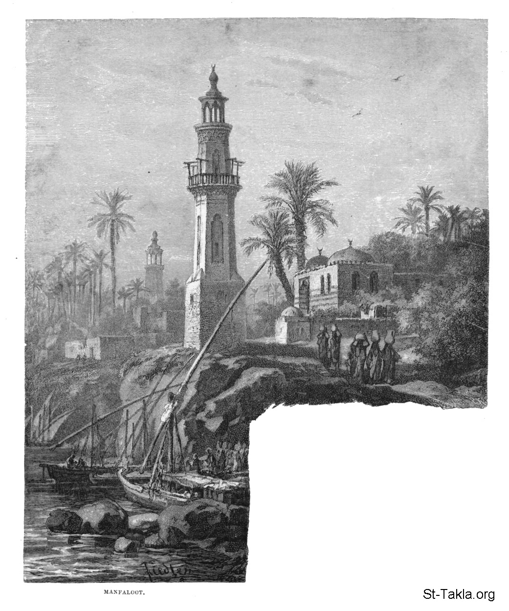 منفلوط، رسم الفنان بيرنهارد فيدلر - من صور كتاب: مصر: وصفيًّا، تاريخيًّا وتصويريًّا - جزء 2 - لـ جيورج إبيرس (ترجمة كلارا كورتناي بوينتر بيل)، 1885 م.