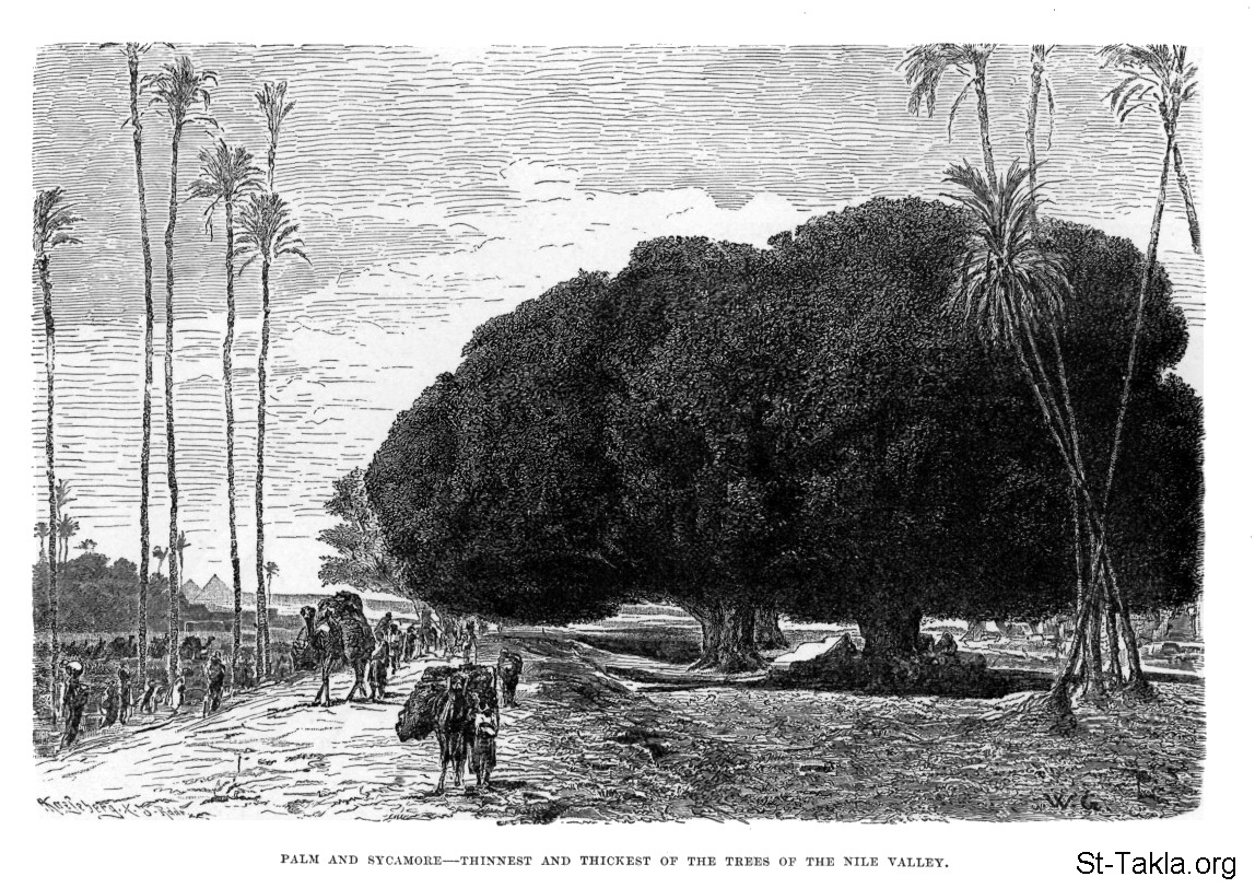 أشجار النخيل وأشجار الجميز، رسم الفنان ويلهلم جينز - من صور كتاب: مصر: وصفيًّا، تاريخيًّا وتصويريًّا - جزء 2 - لـ جيورج إبيرس (ترجمة كلارا كورتناي بوينتر بيل)، 1885 م.