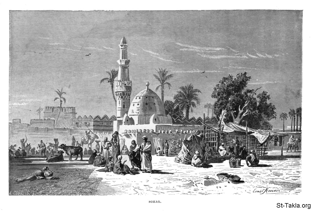 سوهاج، رسم الفنان إرنست كورنر - من صور كتاب: مصر: وصفيًّا، تاريخيًّا وتصويريًّا - جزء 2 - لـ جيورج إبيرس (ترجمة كلارا كورتناي بوينتر بيل)، 1885 م.