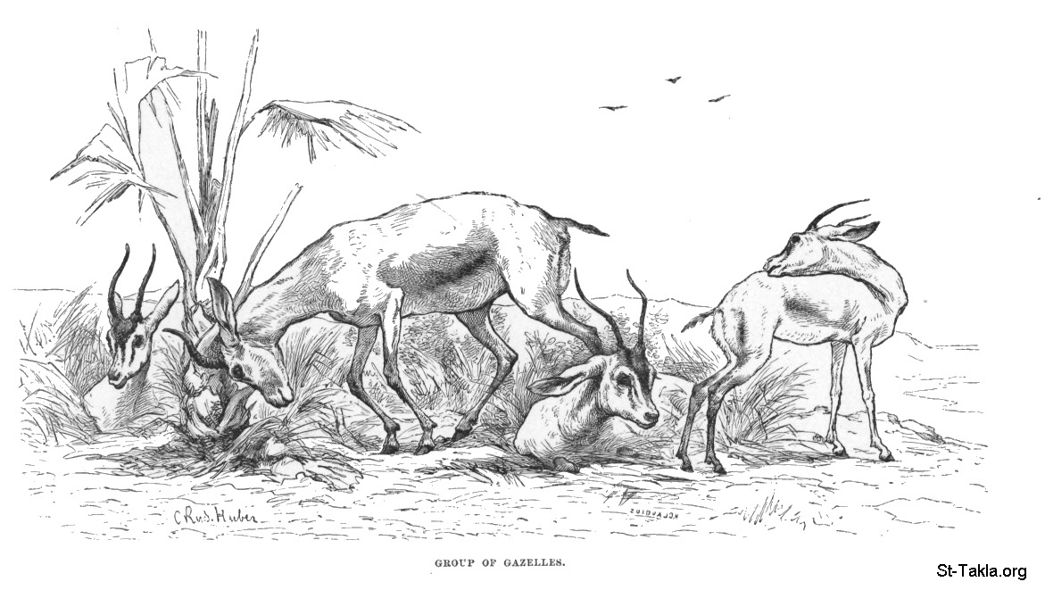 مجموعة من الغزلان: غزال، رسم الفنان سي. رودلف هوبر - من صور كتاب: مصر: وصفيًّا، تاريخيًّا وتصويريًّا - جزء 2 - لـ جيورج إبيرس (ترجمة كلارا كورتناي بوينتر بيل)، 1885 م.