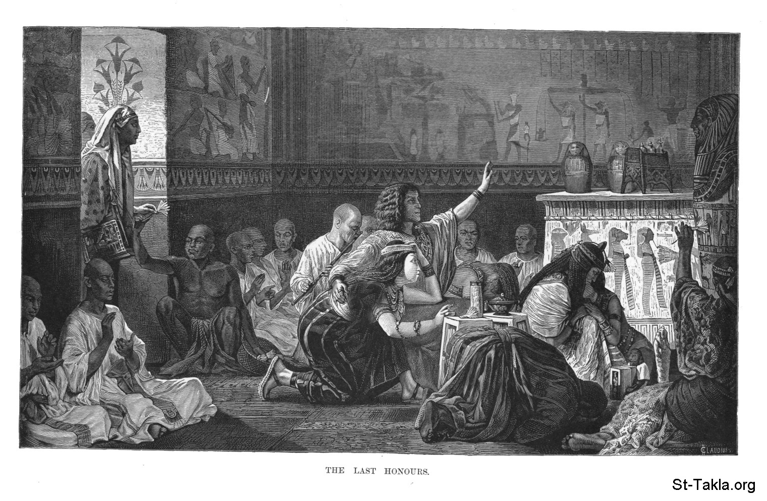 مراسم الوداع الأخيرة لأحد المتوفين في مصر القديمة، رسم الفنان ألما تاديما - من صور كتاب: مصر: وصفيًّا، تاريخيًّا وتصويريًّا - جزء 2 - لـ جيورج إبيرس (ترجمة كلارا كورتناي بوينتر بيل)، 1885 م.