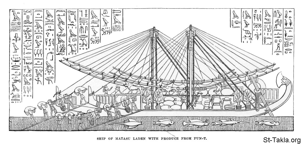 Ship of Hatasu Laden with Produce from Pun-t, by Weidenbach - from the book: Egypt: Descriptive, Historical, and Picturesque - Vol. 2 - by Georg Ebers (tr. Clara Courtenay Poynter Bell), 1885.