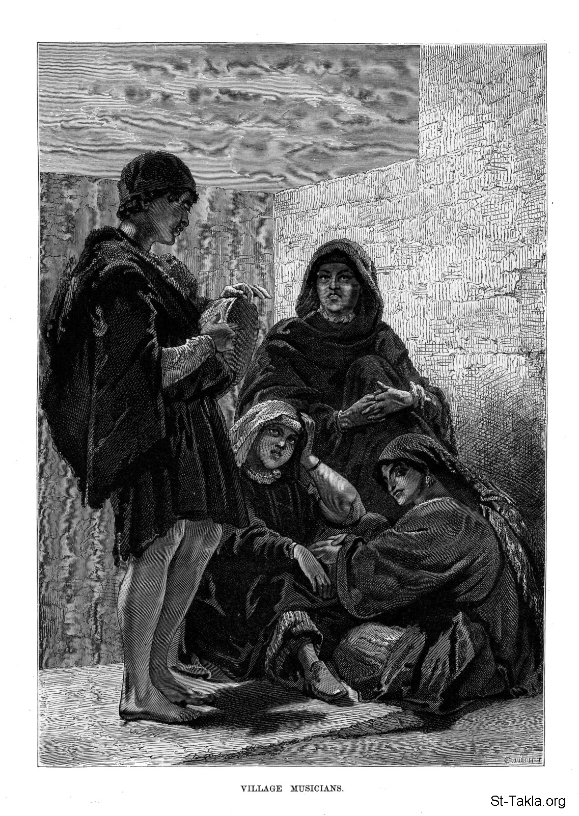 مجموعة من الموسيقيين في القرية، رسم الفنان جوستاف ريختر - من صور كتاب: مصر: وصفيًّا، تاريخيًّا وتصويريًّا - جزء 2 - لـ جيورج إبيرس (ترجمة كلارا كورتناي بوينتر بيل)، 1885 م.