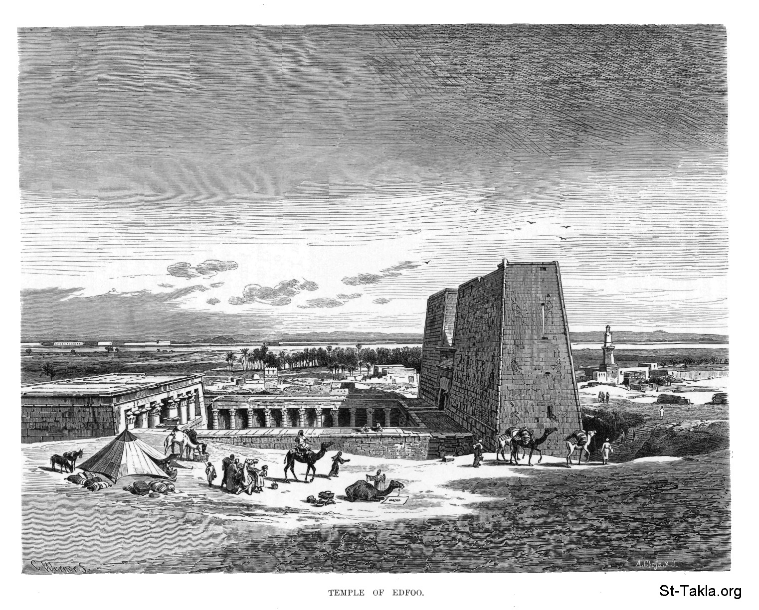 معبد إدفو، رسم الفنان كارل فيرنر - من صور كتاب: مصر: وصفيًّا، تاريخيًّا وتصويريًّا - جزء 2 - لـ جيورج إبيرس (ترجمة كلارا كورتناي بوينتر بيل)، 1885 م.