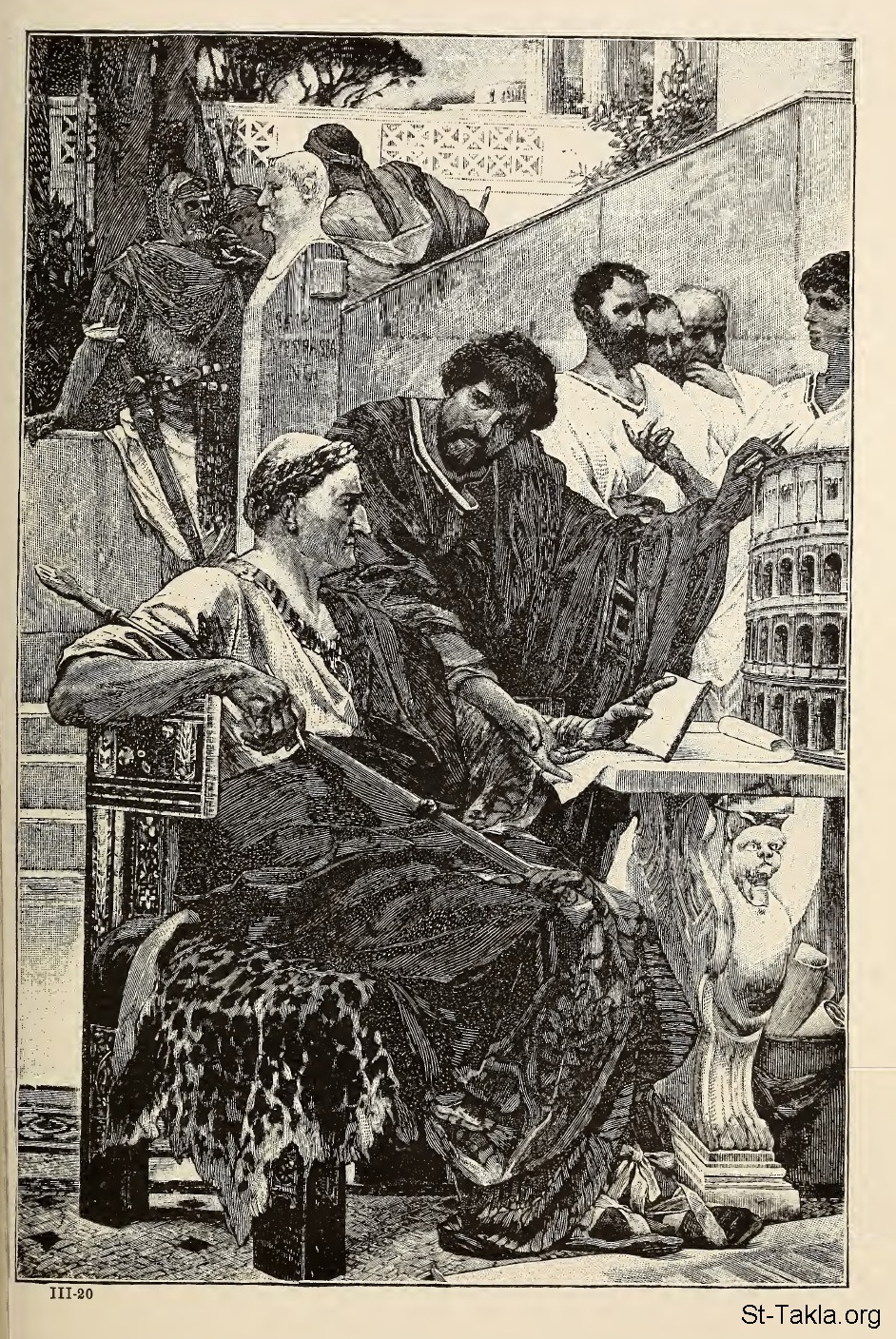Vespasian Plans the Colosseum (The Emperor in Discussion with his Architect) - From a painting by Paul Siberg at Rome. - from the book: The Story of the Greatest Nations 3, by Edward S. Ellis and Francis Horne, 1901-1914.