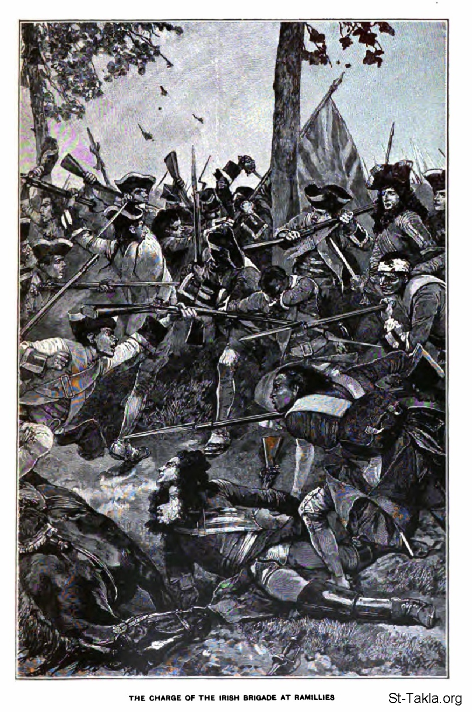 هجوم اللواء الأيرلندي على راميليس، الأراضي المنخفضة الإسبانية (معركة رامييه، القرن الثامن عشر). - من كتاب الأمم الكبرى 5، إدوارد إس. إيليس وتشارلز فرانسيس هورن، 1901-1914 م.