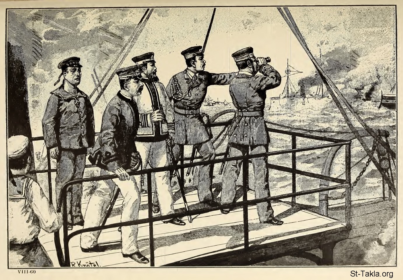 The War with China (A Japanese Warship opens che War by Sinking a Chinese Troop Ship), from a drawing by the German artist, B. Knoetel. - from the book: The Story of the Greatest Nations 8, by Edward S. Ellis and Francis Horne, 1901-1914.