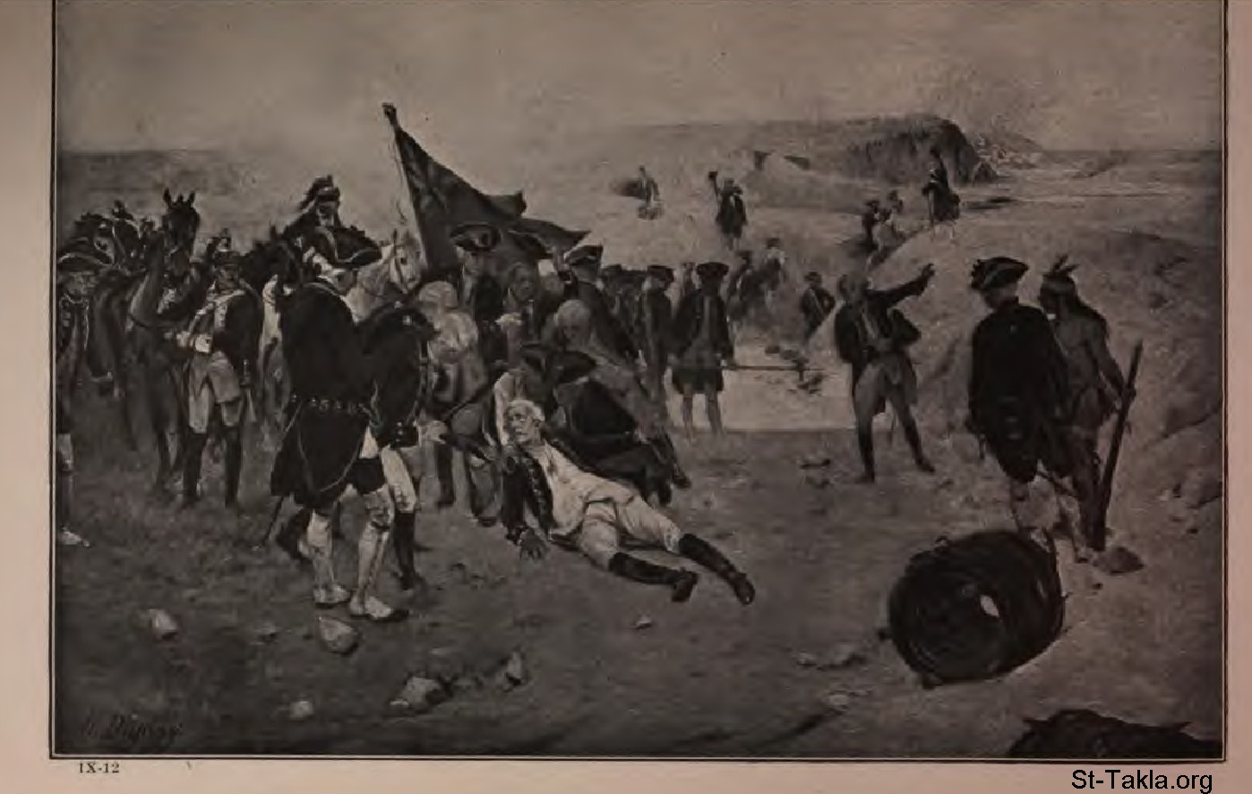 Death of Wolfe (The French and English Leaders Both Fall in the Battle of Quebec), from a painting by the English artist, N. Dupray. - from the book: The Story of the Greatest Nations 9, by Edward S. Ellis and Francis Horne, 1901-1914.